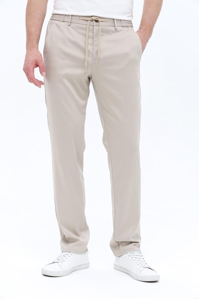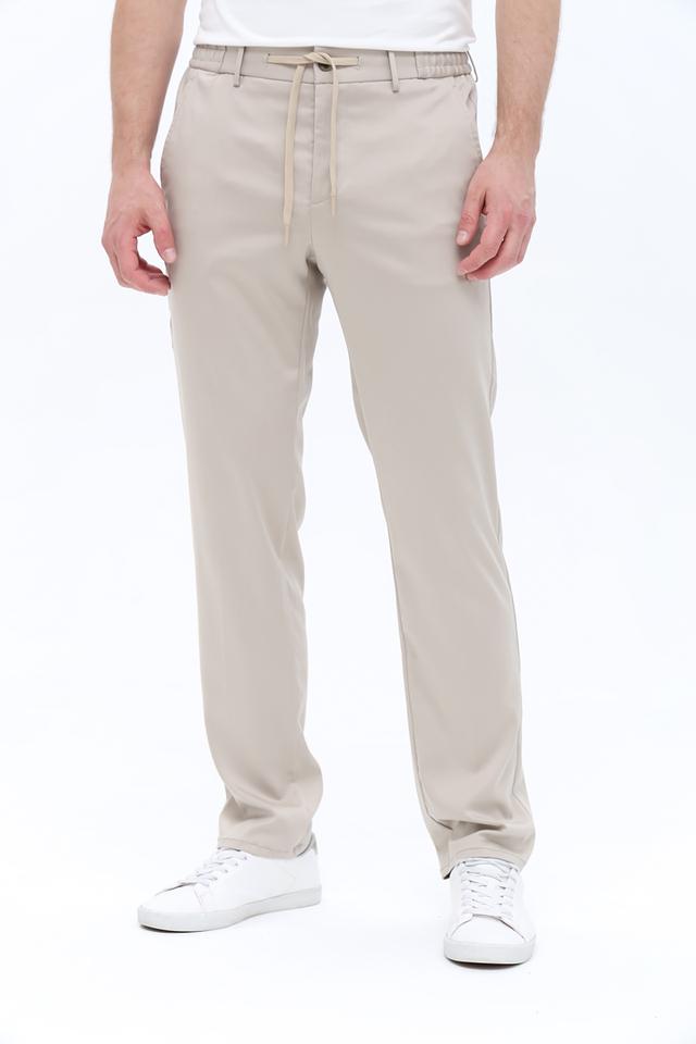 Брюки имеют прямой крой и классическую посадку, что делает их универсальными для разных типов фигуры. Эластичный пояс с кулиской обеспечивает комфортную и надежную фиксацию. Ткань состоит из 96% луоселла и 4% эластана, что гарантирует приятные тактильные ощущения, износостойкость и небольшую степень усадки после стирки.