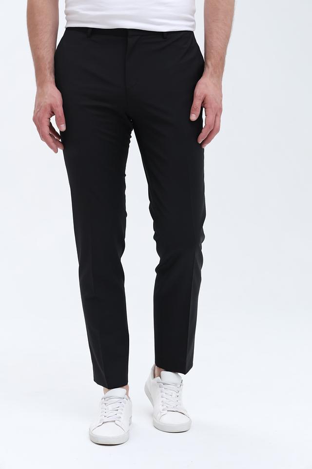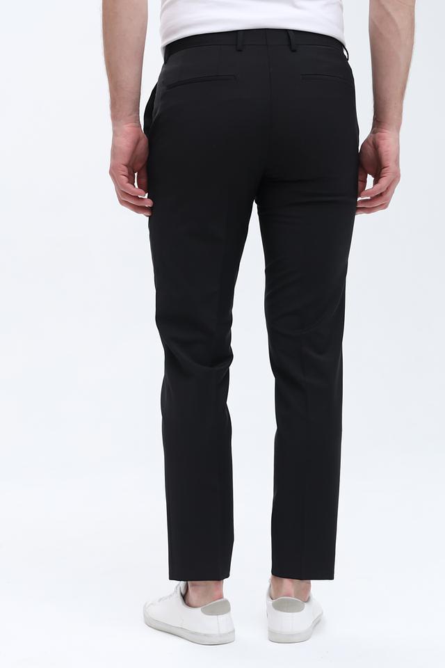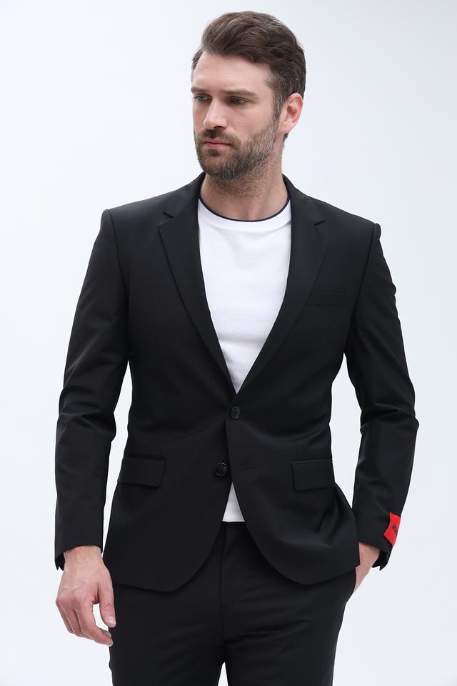 Мужской костюм Hugo классического кроя, выполнен из чёрной шерсти с добавлением полиэстера и эластана. Модель включает пиджак с однобортной застёжкой и брюки прямого кроя. Состав: шерсть 74%, полиэстер 22%, эластан 4%