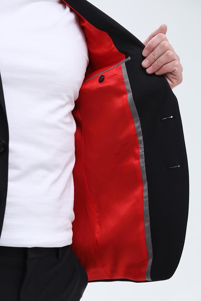 Пиджак имеет однобортную застёжку на пуговицах, лацканы стандартной ширины и функциональные карманы с клапанами. Подкладка пиджака выполнена из гладкой ткани красного цвета, что добавляет элегантности и стиля. На левом рукаве пиджака расположена фирменная нашивка Hugo красного цвета.