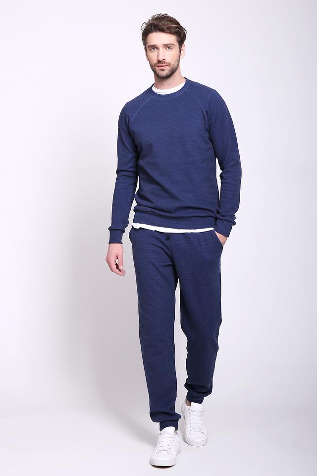 Толстовка имеет круглый вырез горловины и длинные рукава с манжетами. На плечах и рукавах имеются декоративные вставки. Брюки оснащены эластичным поясом с регулирующим шнурком и манжетами внизу. На брюках также присутствуют боковые карманы.