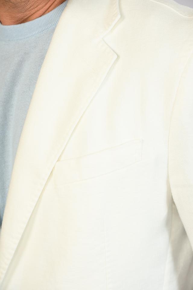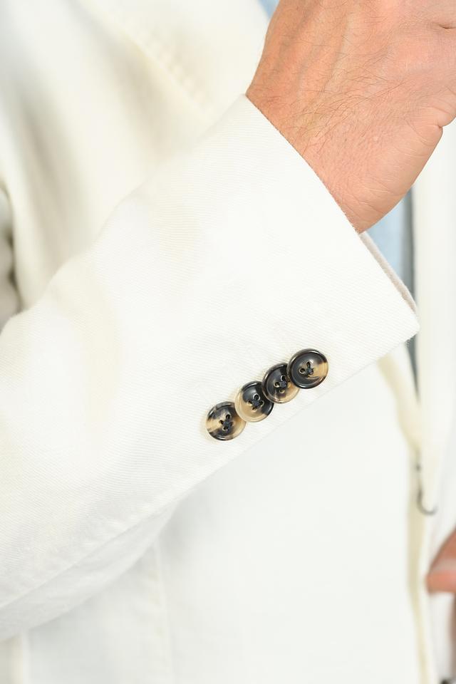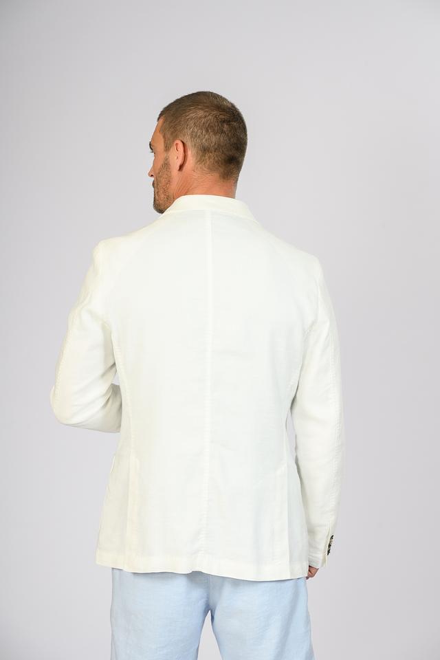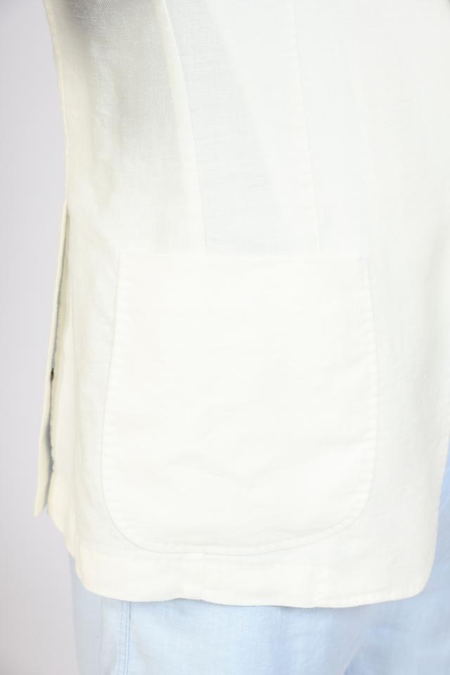 Пиджак застегивается на две пуговицы. Накладные карманы добавляют практичности. Подкладка отсутствует.