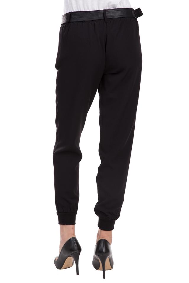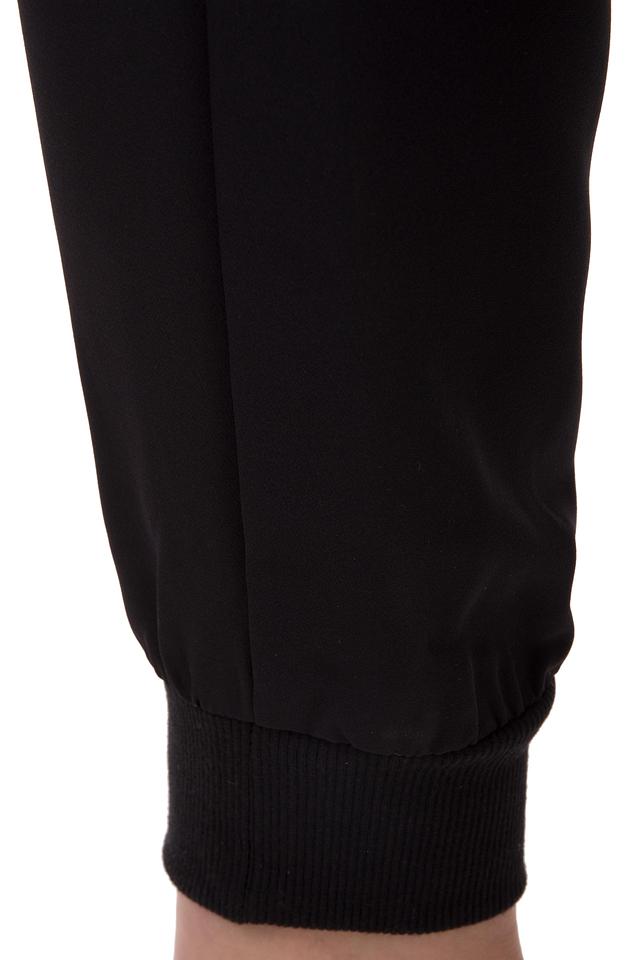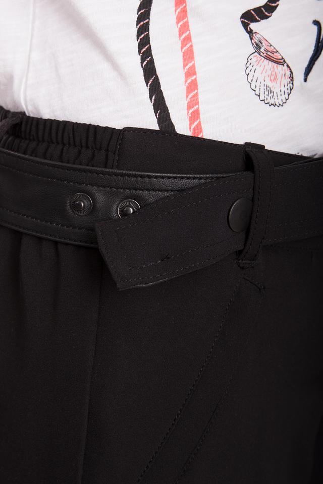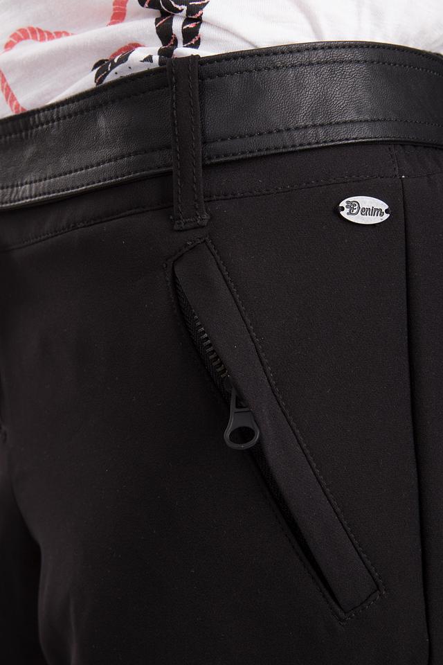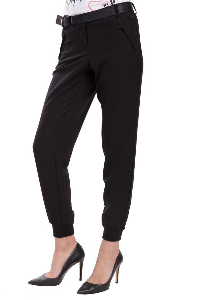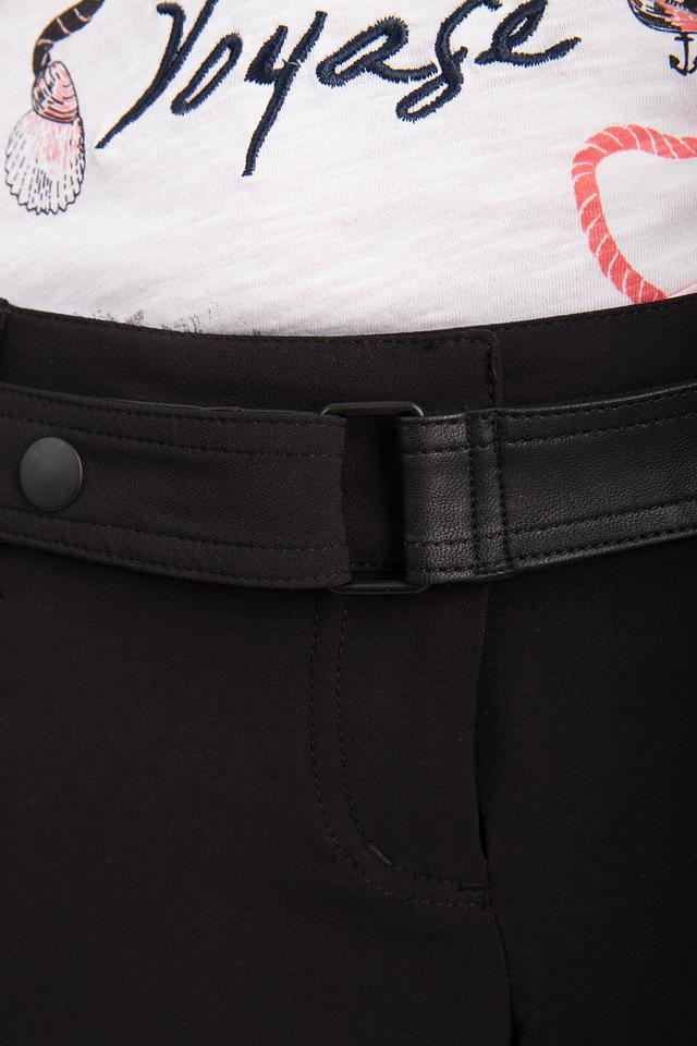 Брюки имеют прямой крой и слегка зауженный силуэт к низу, что делает их универсальными для разных типов фигуры. Особенностью модели является эластичный пояс с декоративным ремнём, который подчеркивает талию и добавляет образу изысканности.