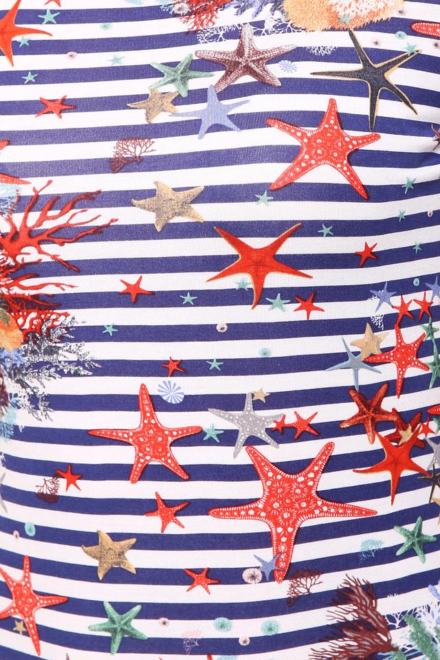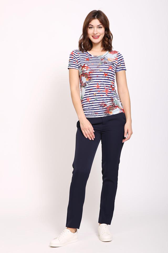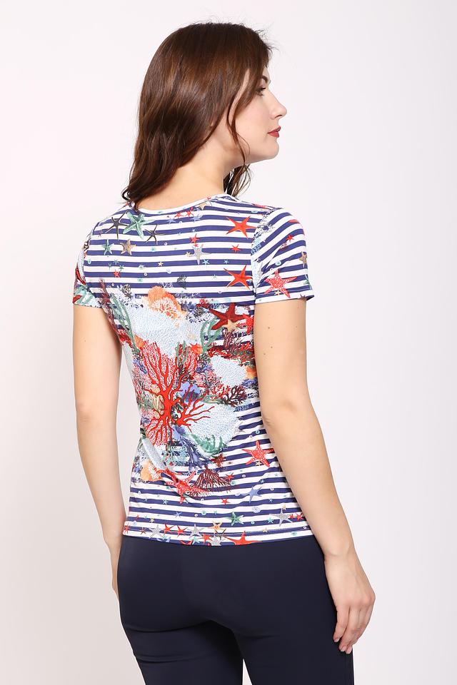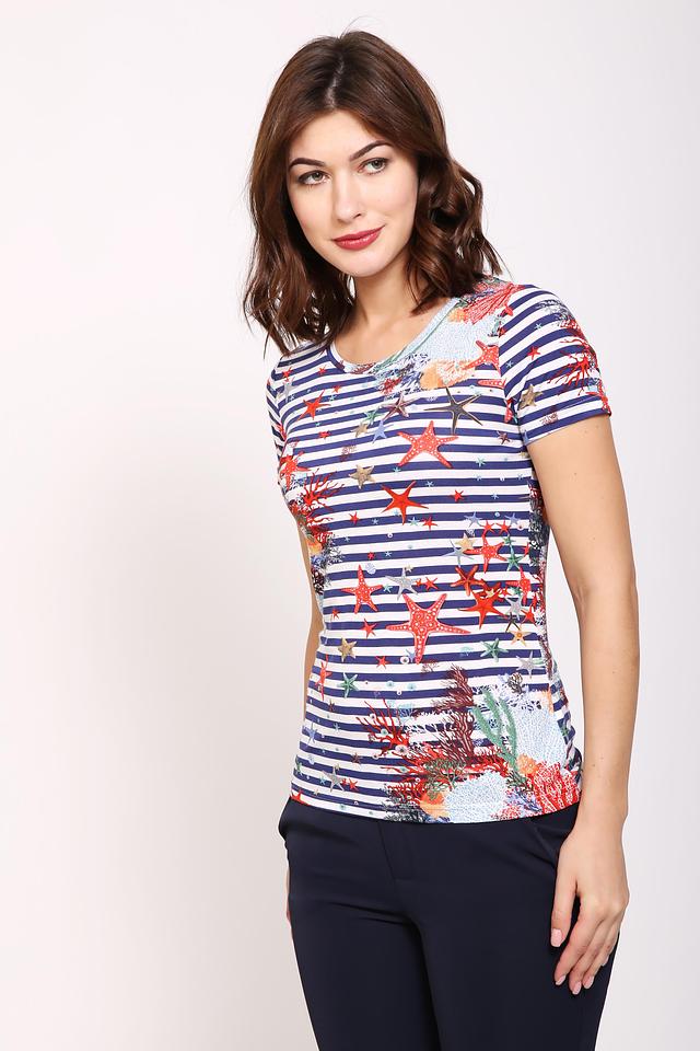 Женская футболка Pezzo синего цвета с ярким морским принтом станет отличным дополнением к летнему гардеробу. Изготовлена из мягкой вискозы с добавлением эластана для комфорта и хорошей посадки. Состав: вискоза 95%, эластан 5%