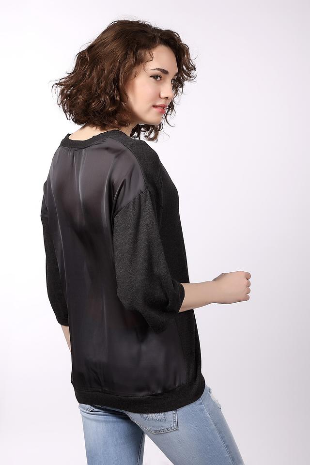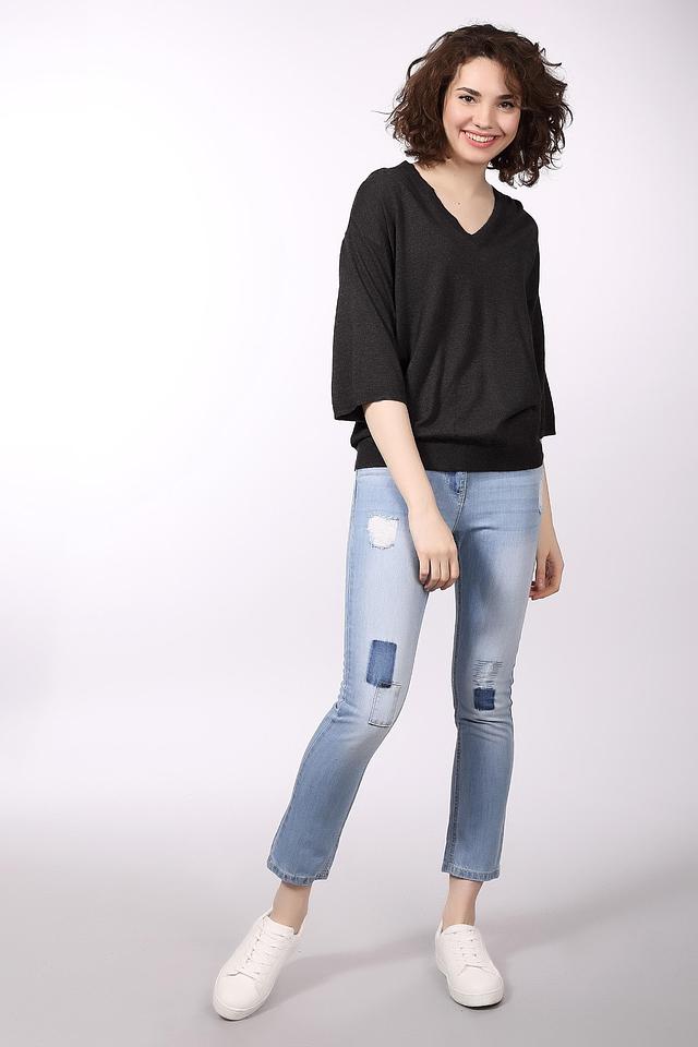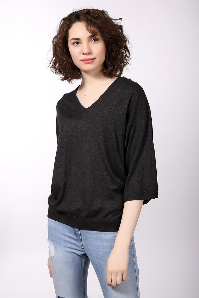 Пуловер имеет V-образный вырез, который визуально удлиняет шею и делает силуэт более изящным. Рукава 3/4 добавляют образу лёгкости и непринуждённости. Свободный крой обеспечивает комфорт при носке и позволяет свободно двигаться.