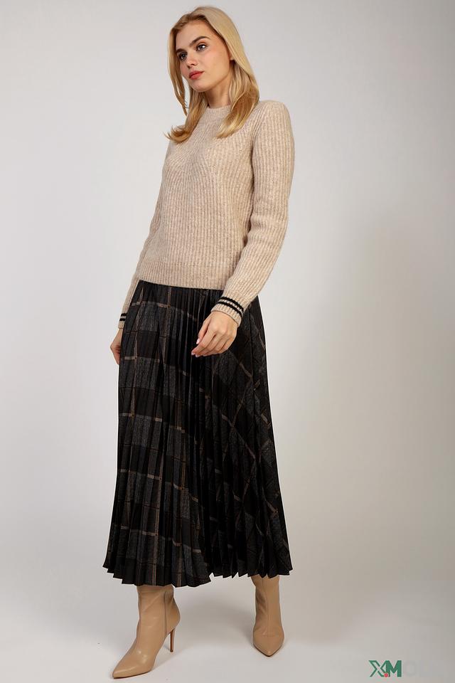 Юбка имеет плиссированную фактуру и длину миди, что делает ее универсальной для различных случаев. Эластичный пояс обеспечивает комфортную посадку по фигуре.