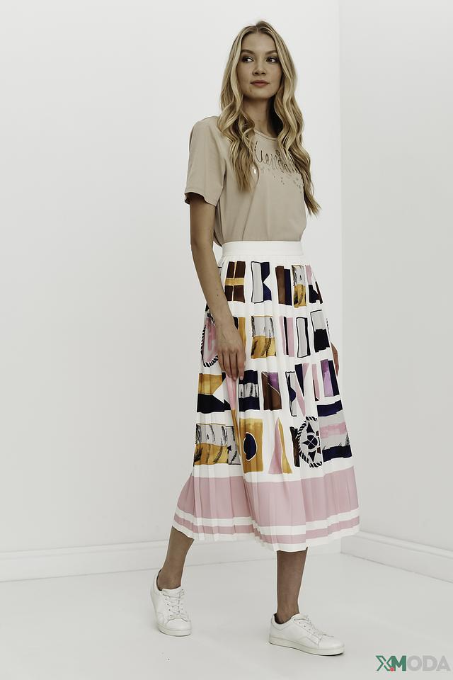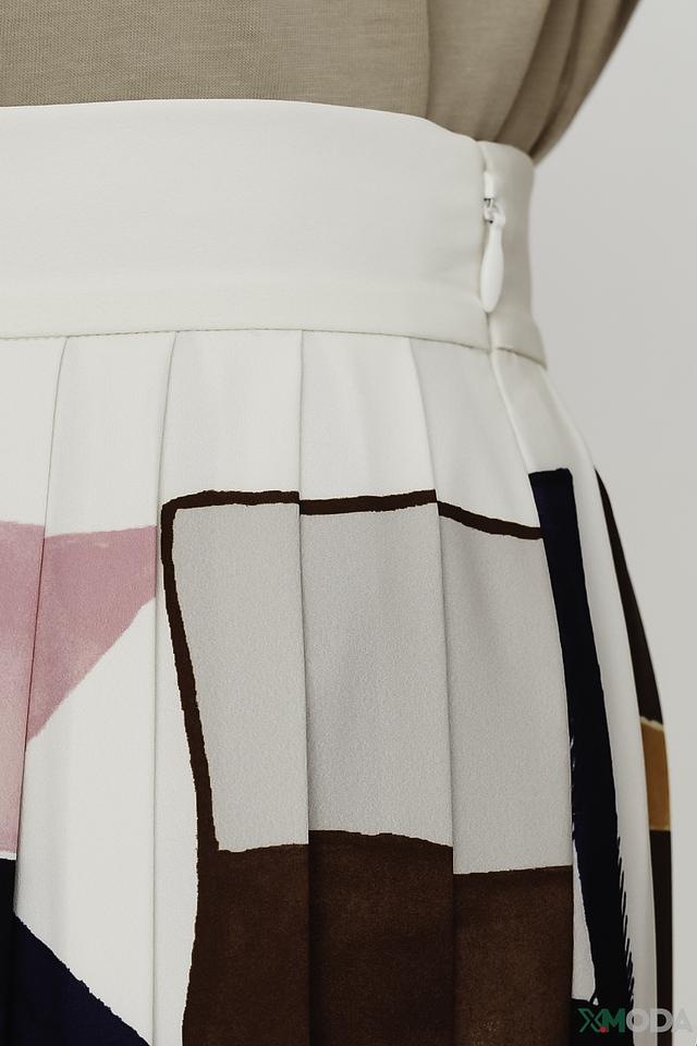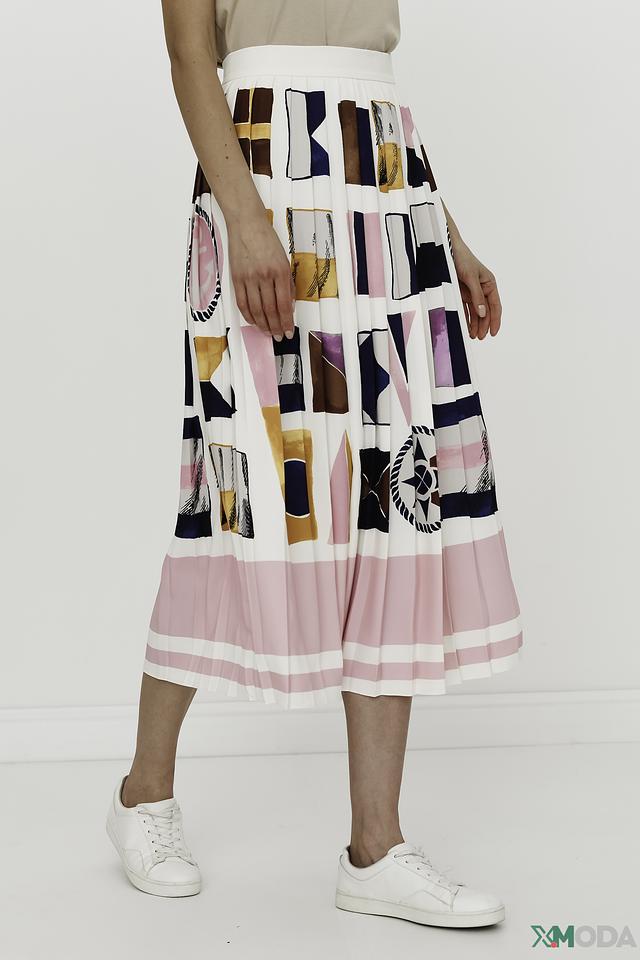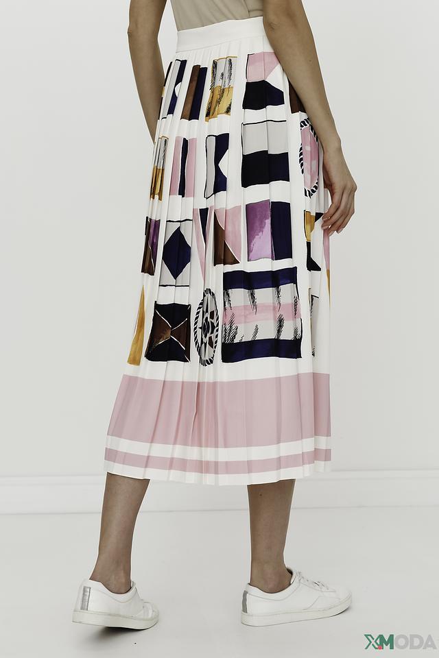 Юбка имеет плиссированную фактуру и украшена оригинальным геометрическим принтом, сочетающим в себе различные оттенки розового, синего, коричневого и белого. Плиссировка придает юбке динамичный и женственный вид.