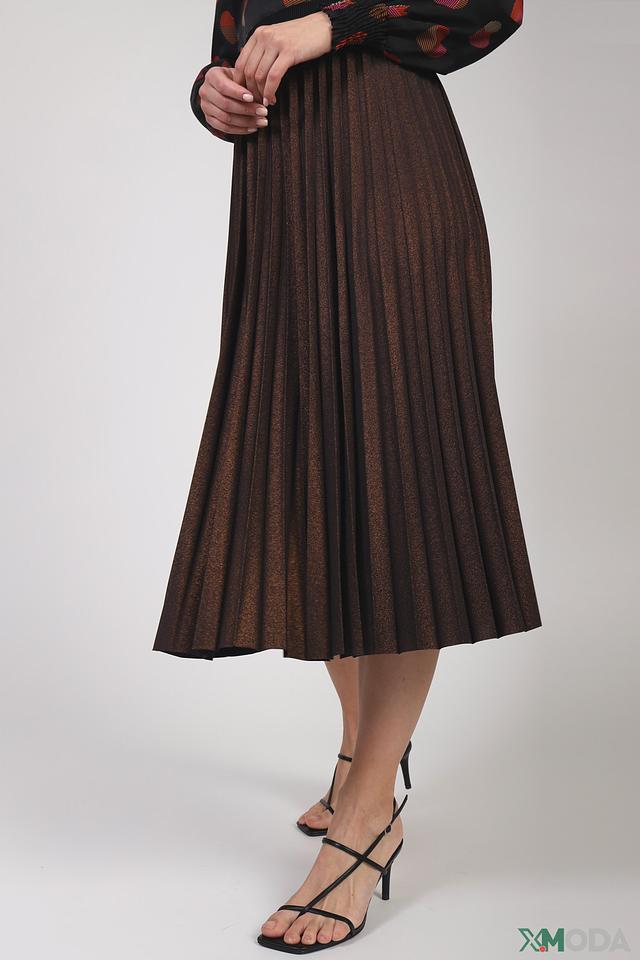 Юбка имеет классический коричневый цвет и плиссированную текстуру, которая придает ей элегантный и женственный вид. Плиссировка выполнена аккуратно и равномерно, создавая красивый ниспадающий силуэт. Эластичный пояс обеспечивает удобную посадку по фигуре и не сковывает движений.