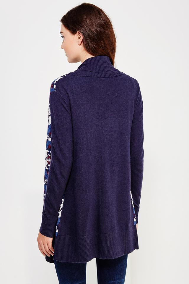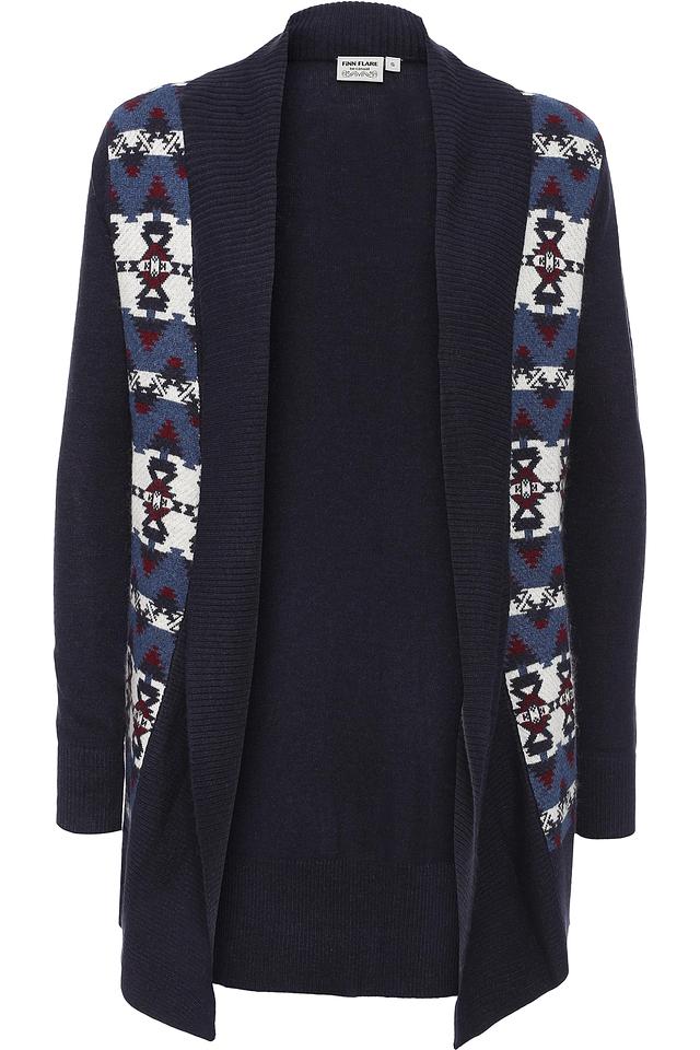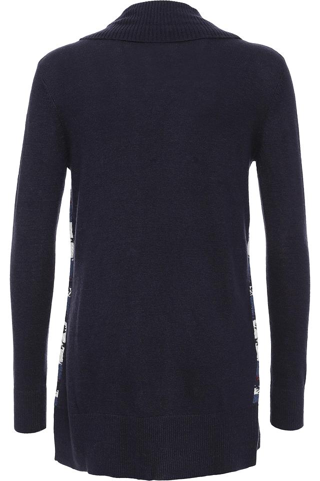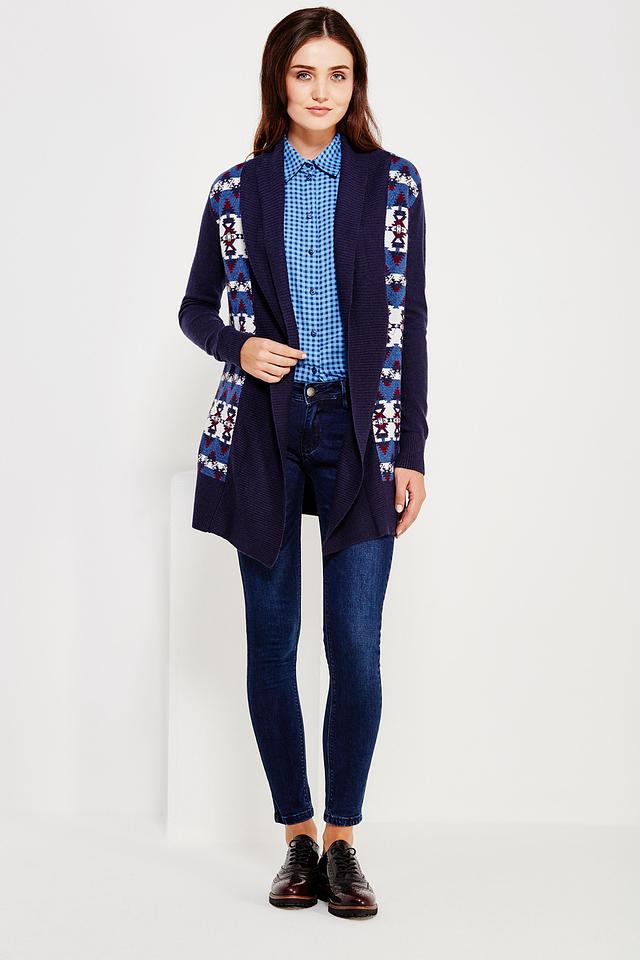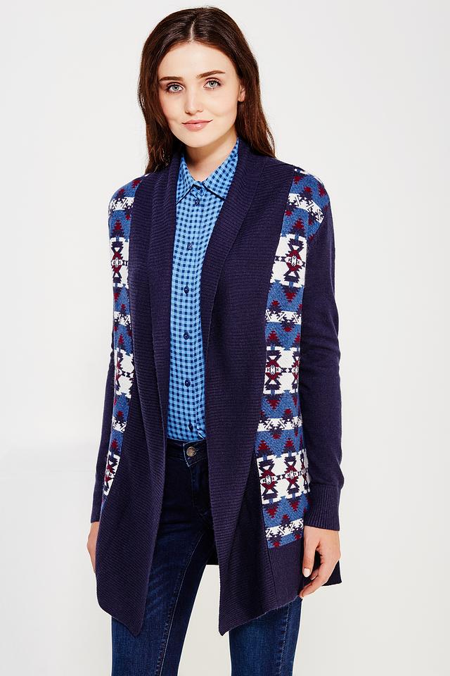Женский жакет FINN FLARE темно-синего цвета с геометрическим узором выполнен из мягкого трикотажа. Модель кардиган свободного кроя, без застежки, с открытыми плечами. Состав: вискоза 55%, нейлон 40%, ангора 5%