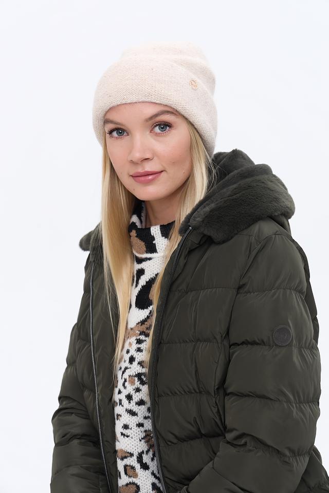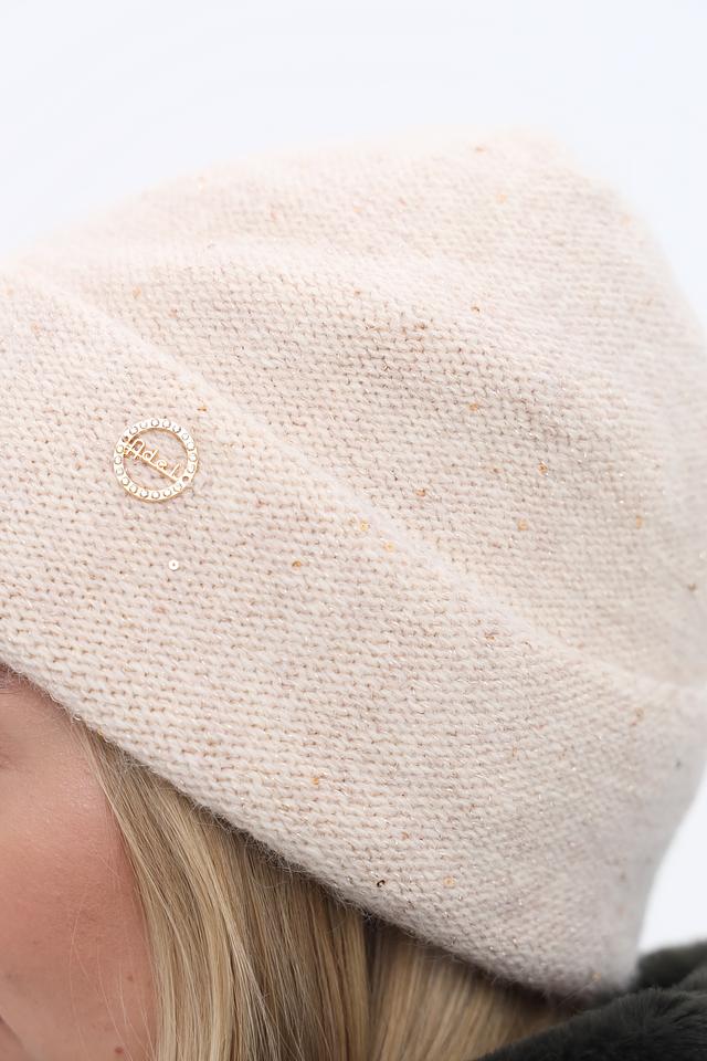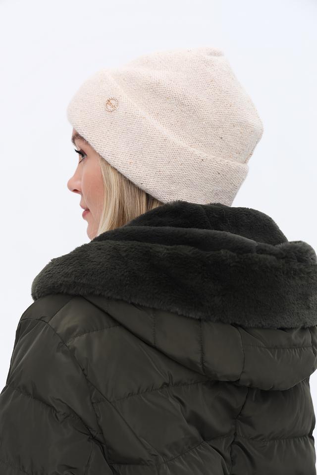 Шапка имеет классический дизайн и нейтральный бежевый цвет, который легко сочетается с различными видами верхней одежды. Небольшой металлизированный логотип бренда добавляет шапке изысканности.