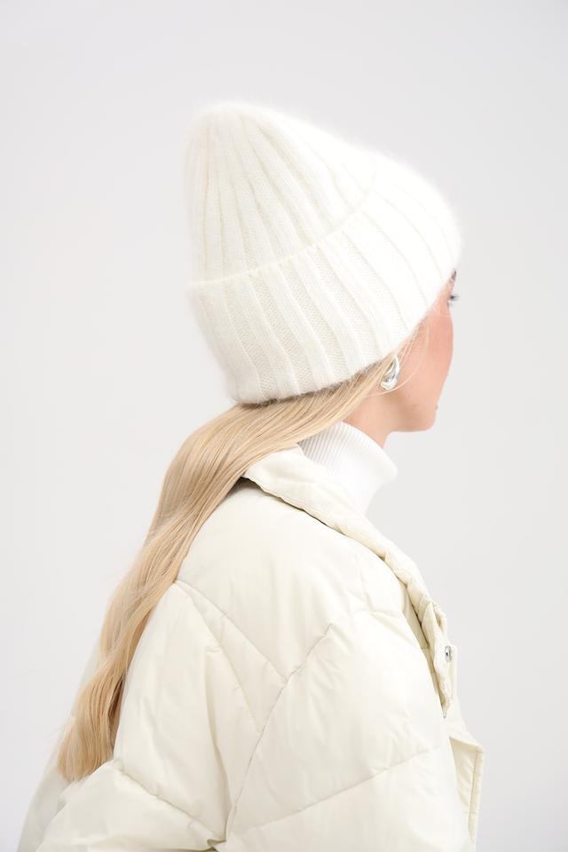 Шапка имеет классический дизайн без лишних деталей, что делает её универсальной и подходящей для разных стилей одежды. Белый цвет шапки легко сочетается с различными оттенками верхней одежды и аксессуаров.