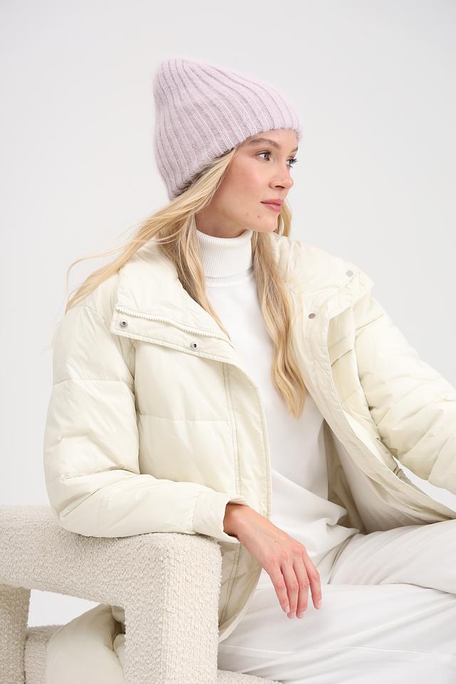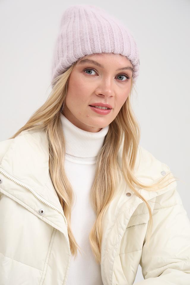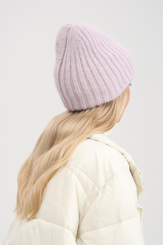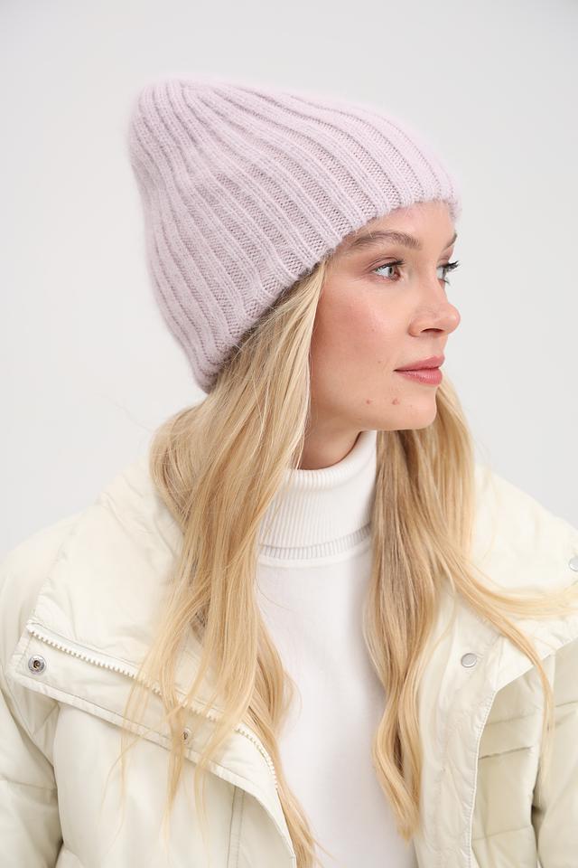 Нежный лавандовый цвет шапки придаёт образу женственность и легкость. Аккуратный рубчик добавляет текстуры и визуального интереса. Шапка плотно прилегает к голове, защищая от ветра и холода.
