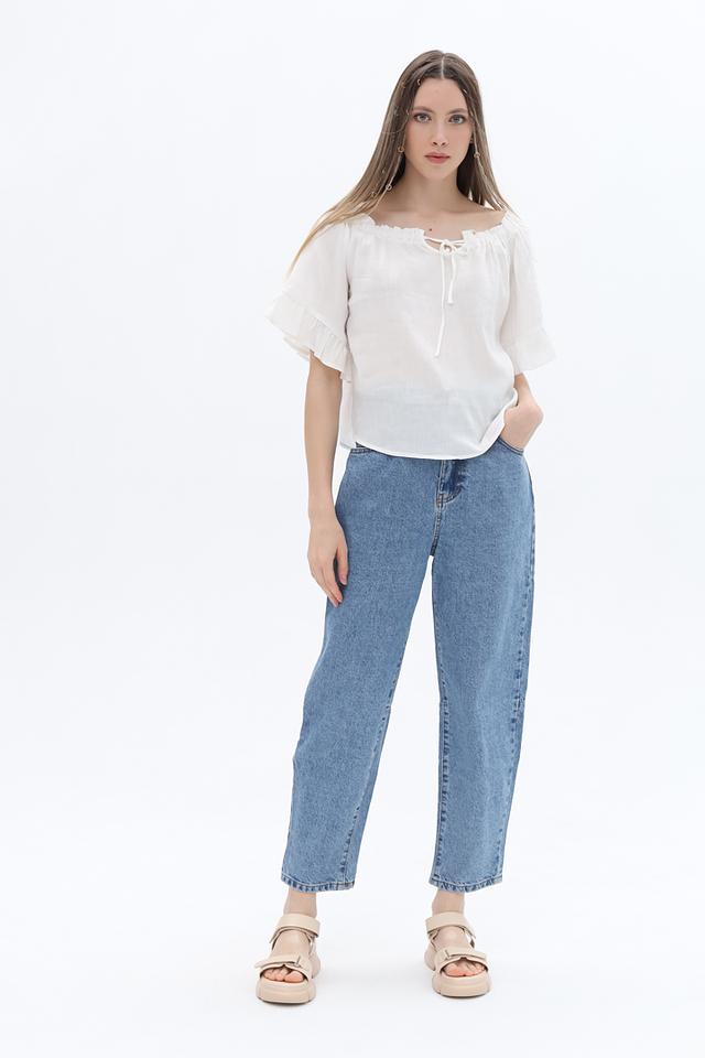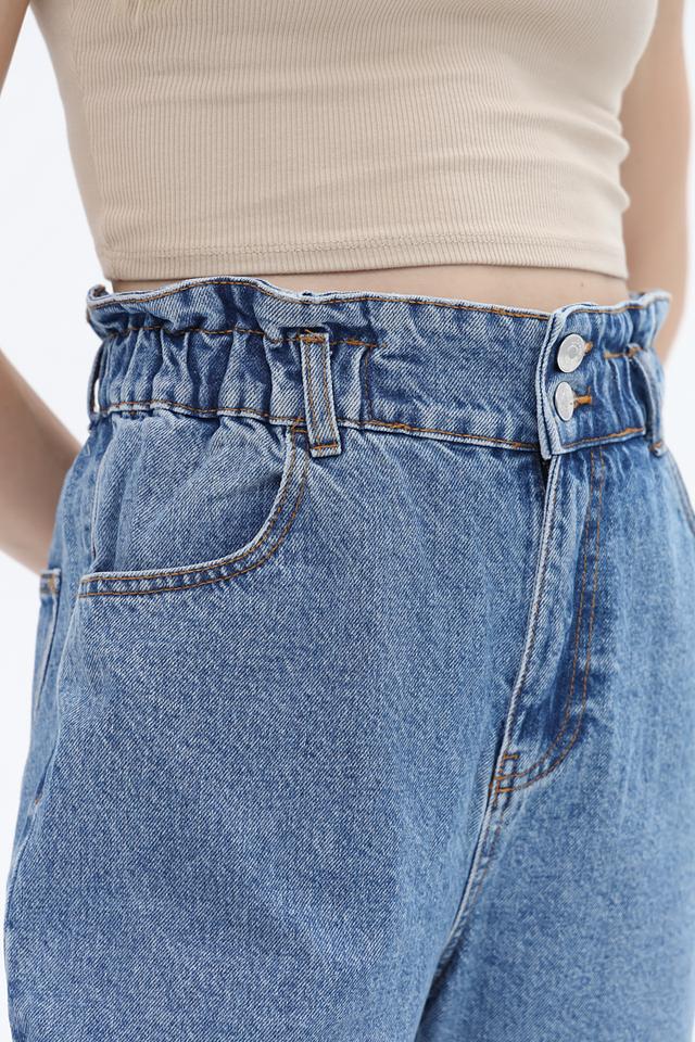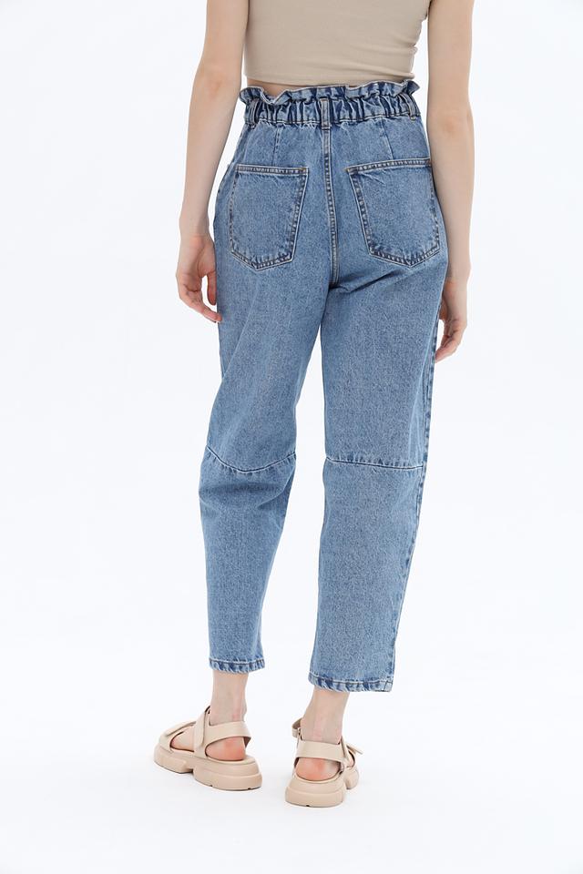 Джинсы имеют высокую посадку, которая подчеркивает талию и визуально удлиняет ноги. Утягивающий пояс обеспечивает комфортную посадку и формирует силуэт. Свободный крой в области бедер и зауженные к низу штанины создают современный и стильный силуэт.