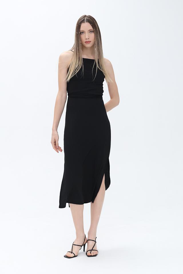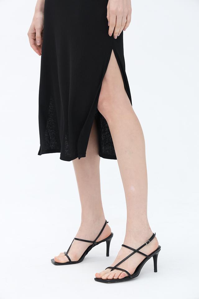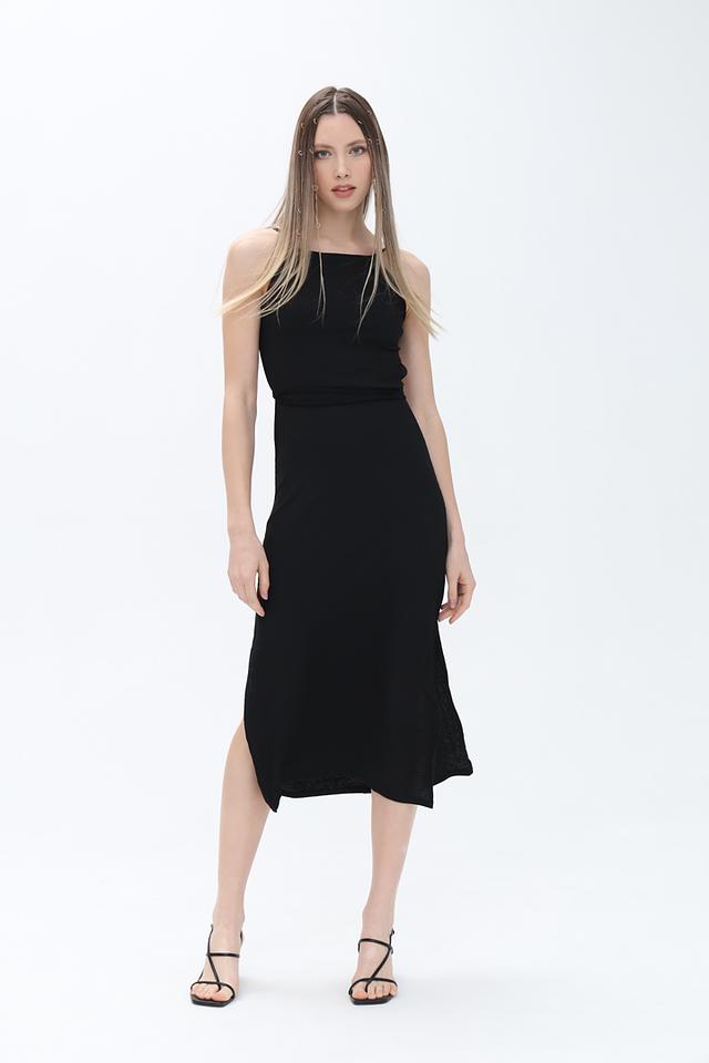 Чёрное платье Alcott на тонких бретелях – элегантный выбор для создания стильного образа. Модель выполнена из приятной к телу ткани с добавлением эластана, что обеспечивает комфорт при носке и хорошую посадку по фигуре. Платье имеет асимметричный разрез сбоку. Состав: полиэстер 88%, эластан 12%