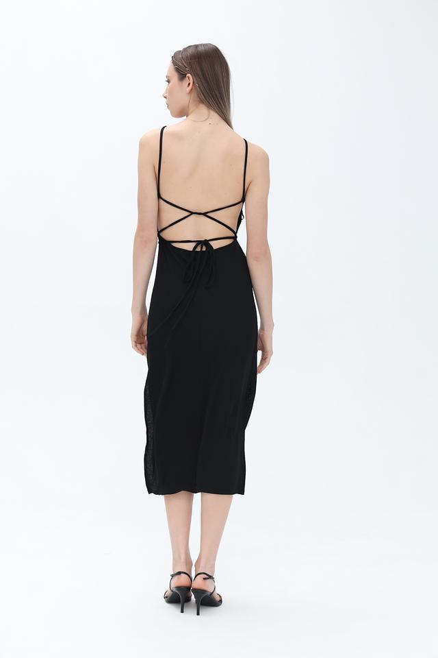 Платье имеет прямой крой, подчеркивающий фигуру, и тонкие бретели. Сбоку предусмотрен асимметричный разрез, добавляющий образу лёгкости и изящества. Застёжка осуществляется с помощью шнуровки на спине, что позволяет регулировать посадку по фигуре.