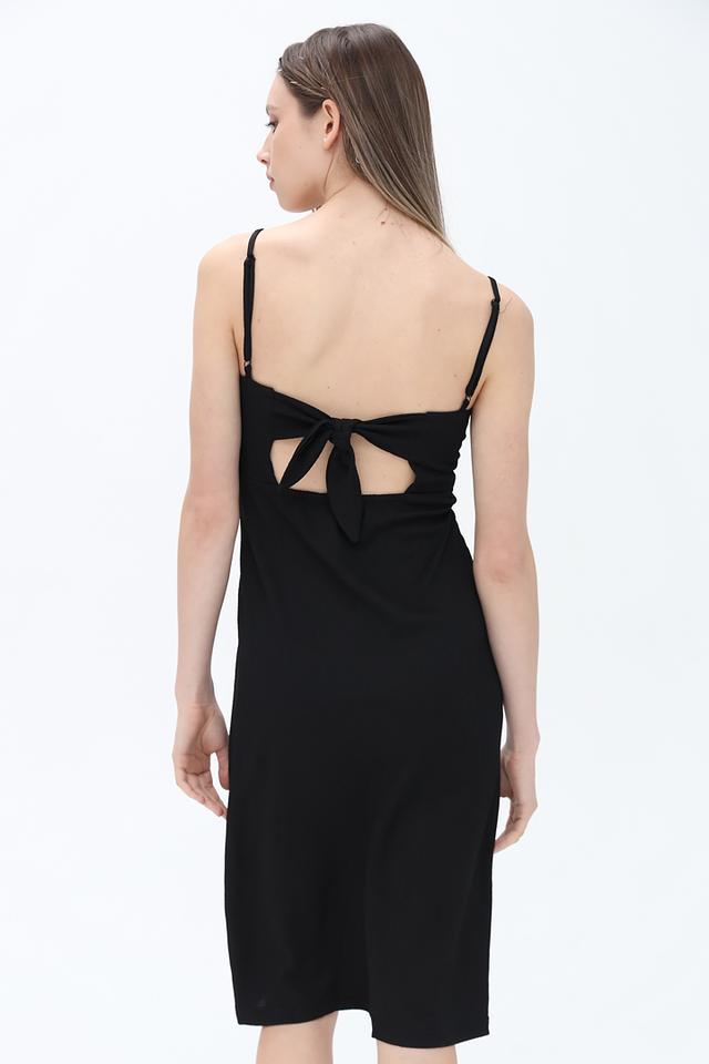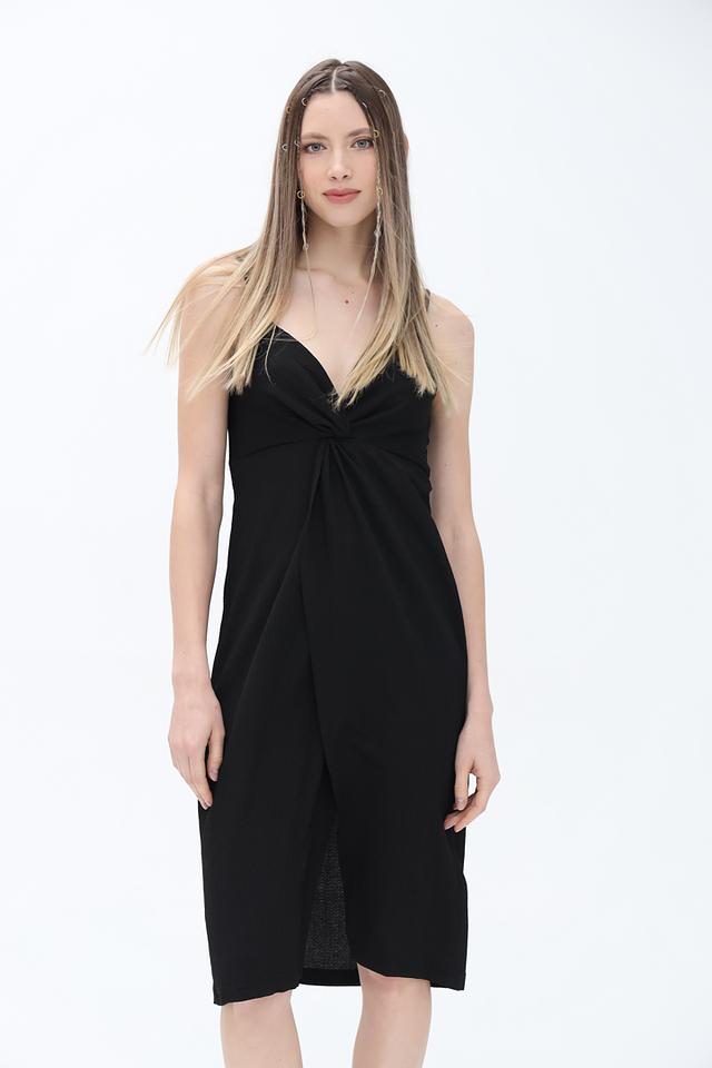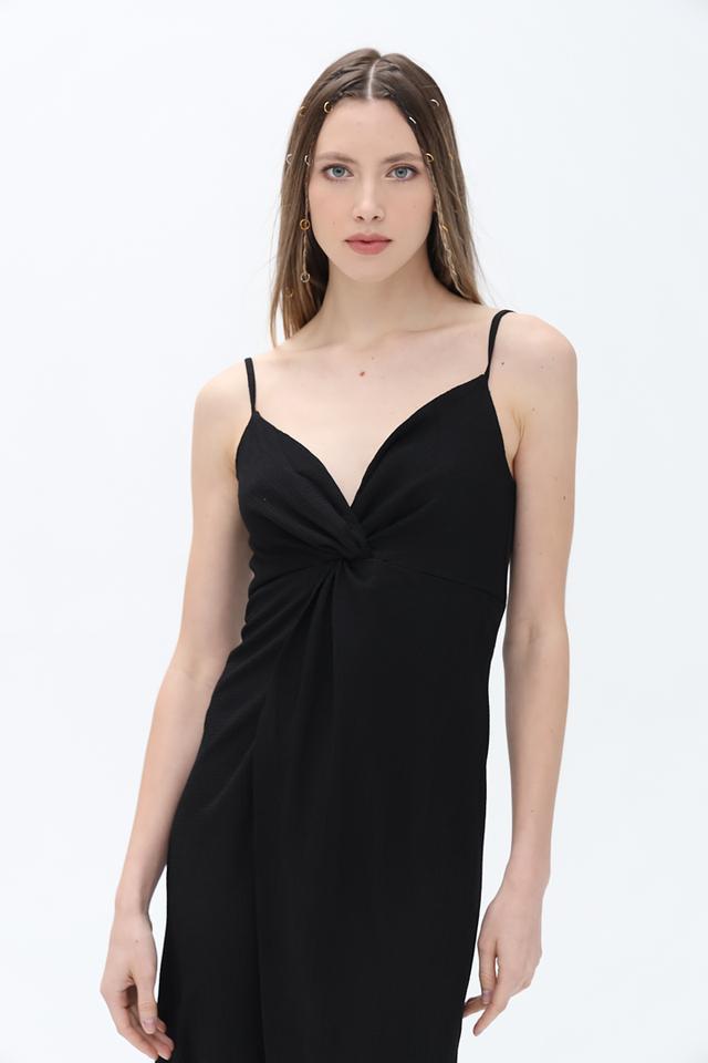 Платье имеет длину миди и приталенный силуэт, подчеркивающий фигуру. Тонкие бретели и глубокий V-образный вырез создают женственный и привлекательный образ. Оригинальный узел на лифе добавляет платью изюминку, а асимметричный крой с разрезом сбоку придает динамичности.