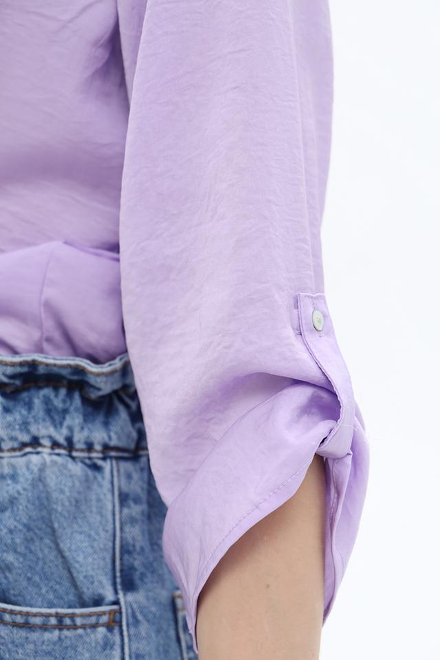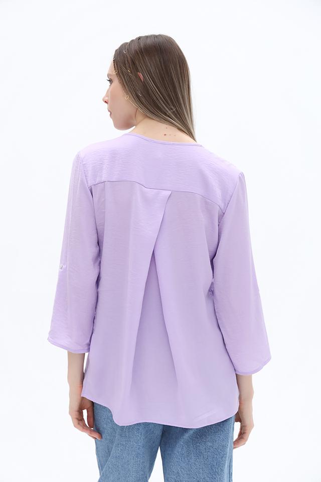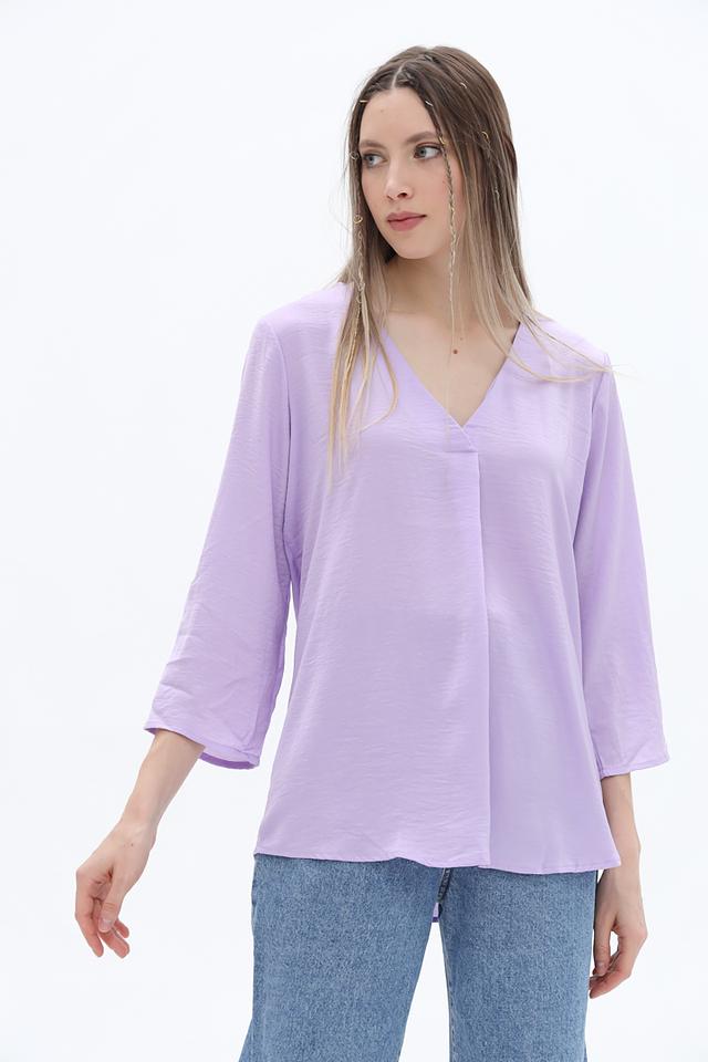 Блуза имеет лавандовый цвет, который придает образу нежность и женственность. V-образный вырез подчеркивает линию шеи, а рукава длиной 3/4 с аккуратными манжетами добавляют изысканности.