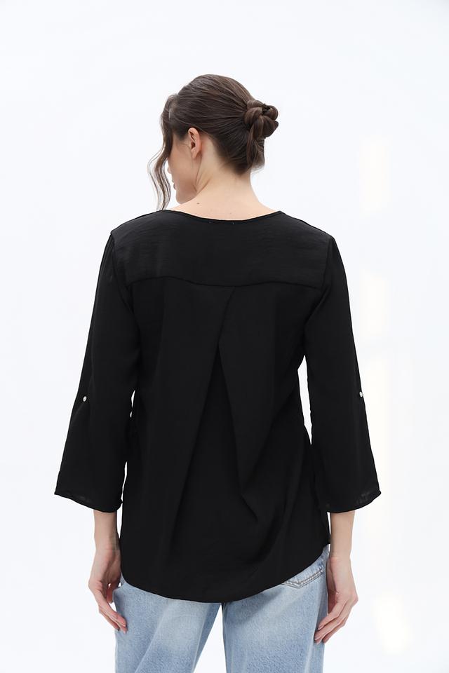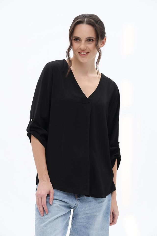 Блуза имеет V-образный вырез, который подчеркивает женственность силуэта. Рукав 3/4 с небольшим сборкой и застежкой на пуговицу добавляет образу изысканности.
