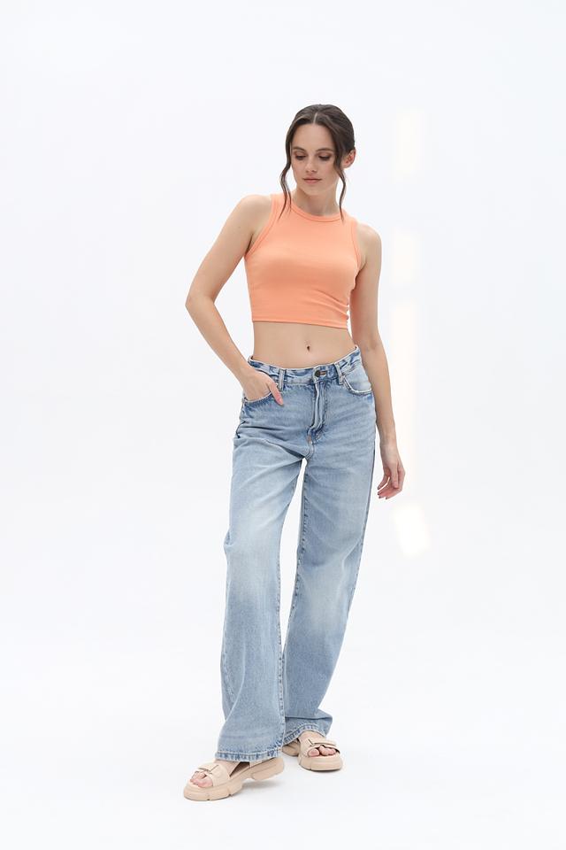 Персиковый цвет топа освежает образ и придает ему женственности. Ткань имеет ребристую текстуру, которая подчеркивает фигуру и добавляет визуальный интерес. Удобный крой и эластичный материал обеспечивают свободу движений и комфорт в течение всего дня.