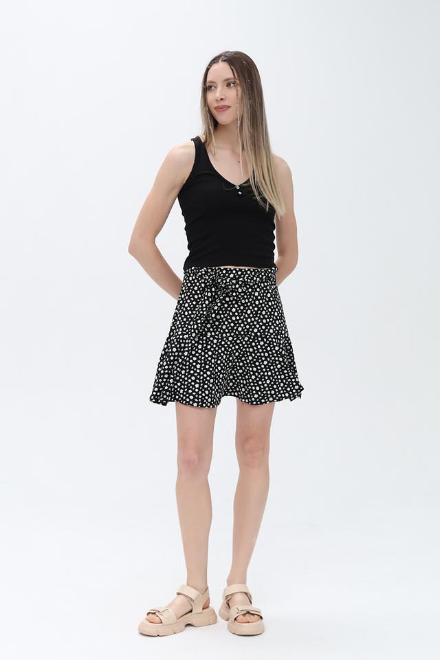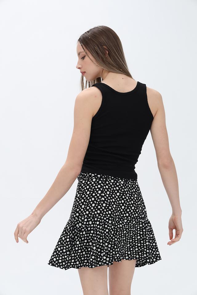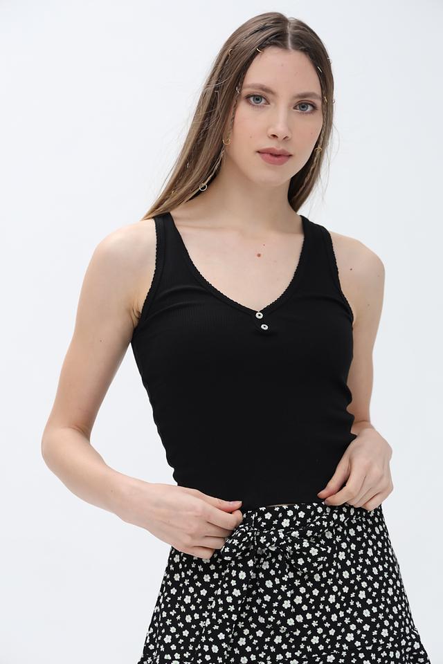 Топ имеет удобный крой на тонких бретелях и V-образный вырез, который визуально удлиняет шею. Декоративные пуговицы добавляют изюминку и делают модель более интересной.