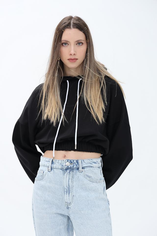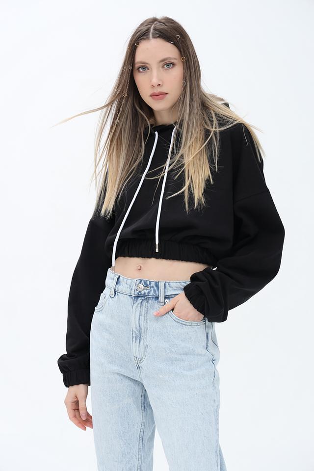 Чёрный джемпер от Alcott с капюшоном и белыми шнурками – стильная и удобная модель для повседневной носки. Укороченный крой и манжеты на рукавах придают образу современный вид. Состав: хлопок 100%