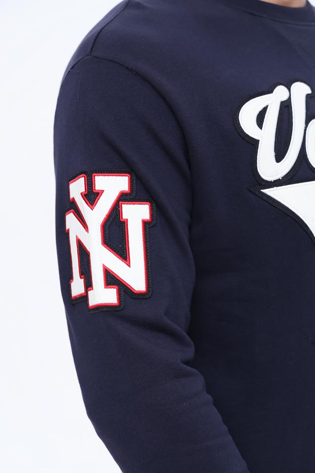 На передней части джемпера расположен надпись "Varsity", выполненная в винтажном стиле. На левом рукаве – контрастная нашивка с логотипом "NY", а на спине – крупный логотип "NEW YORK LEAGUE".