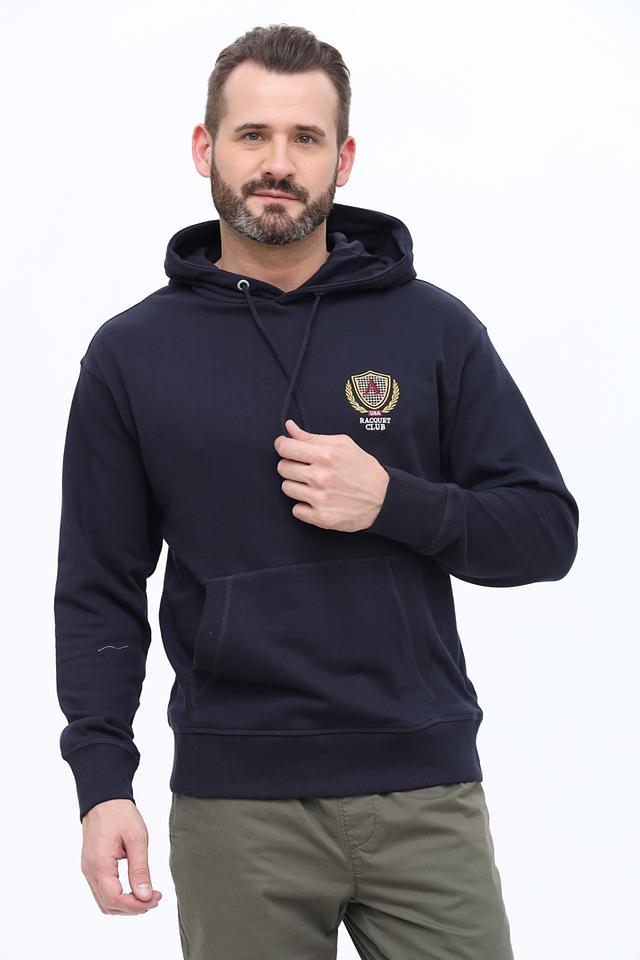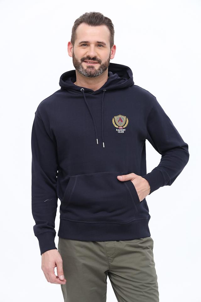 Мужская толстовка Alcott тёмно-синего цвета с нашивкой на груди и спине. Модель выполнена из мягкого хлопка и дополнена капюшоном и карманом-кенгуру. Состав: хлопок 100%