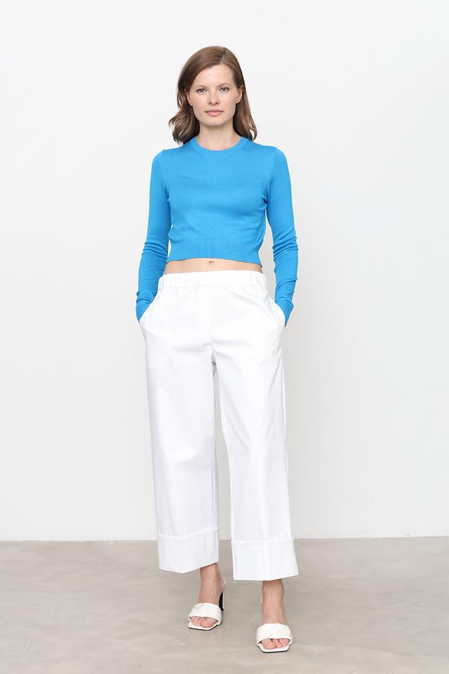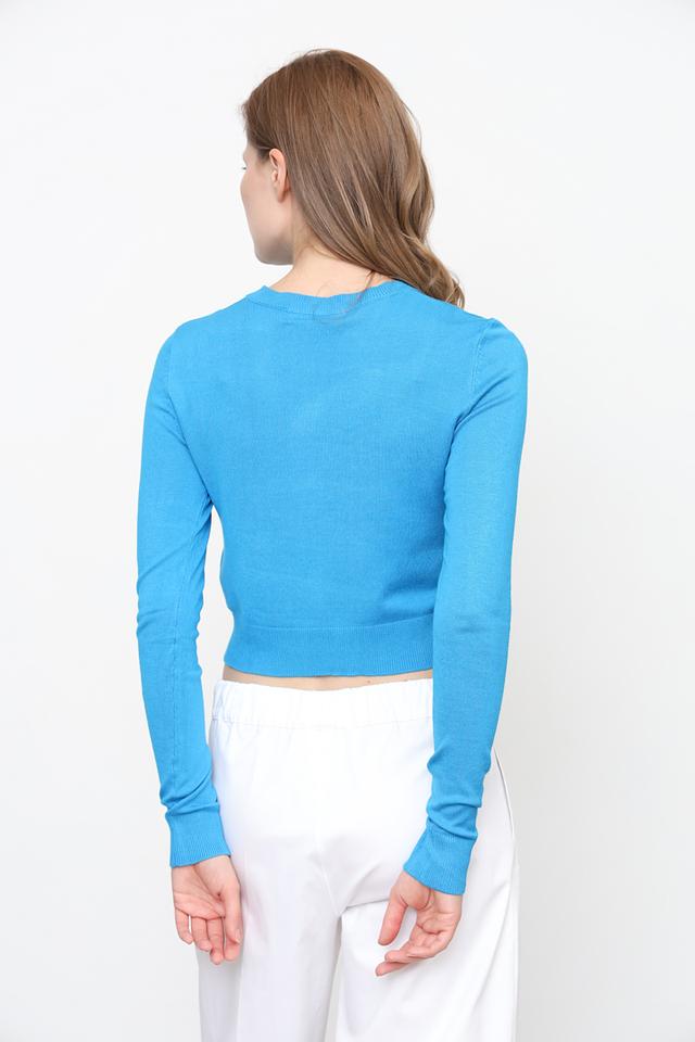 Джемпер имеет укороченный крой и длинные рукава, что делает его идеальным для создания модных образов. Его яркий бирюзовый цвет добавит свежести и оригинальности вашему стилю.