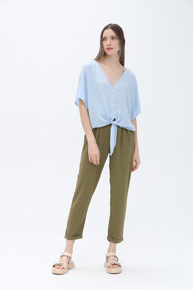 Брюки имеют классический крой с завышенной талией и широким поясом, который подчеркивает фигуру. Пояс дополнен завязками, позволяющими регулировать посадку и создавать различные силуэты.