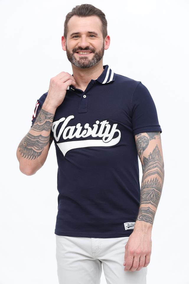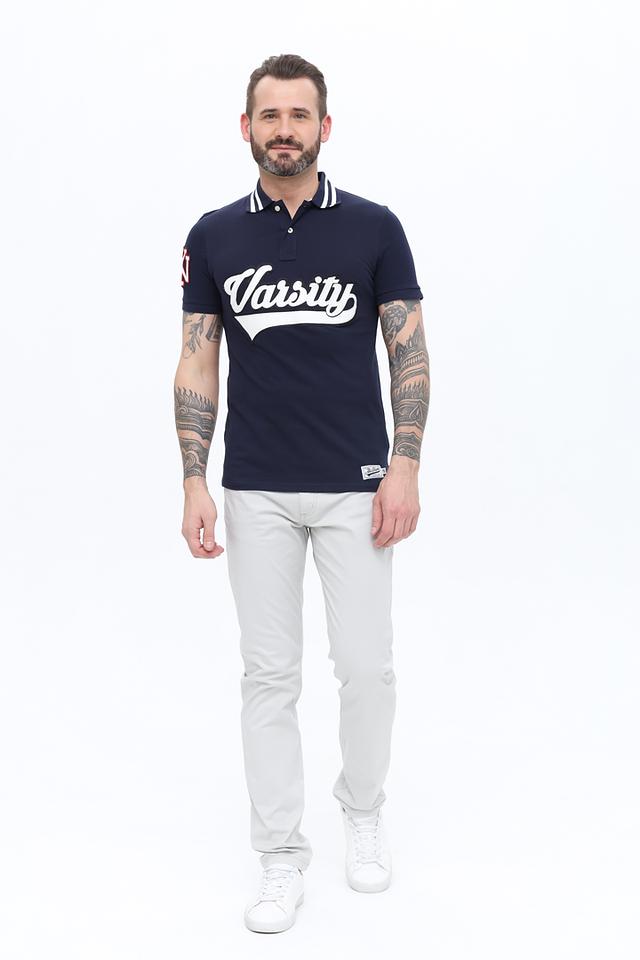 На груди и спине поло украшено крупной надписью "Varsity" и логотипом бренда, выполненными в белом и красном цветах. Воротник поло имеет контрастную белую полоску, что добавляет модели стильный акцент.