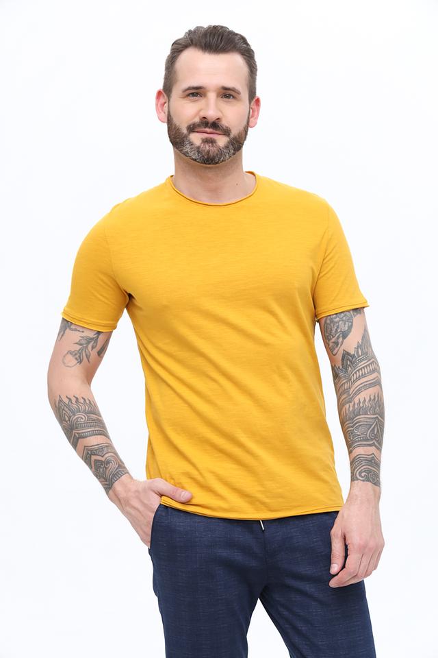 Цвет футболки – горчичный, что делает ее универсальным элементом гардероба, легко сочетающимся с различными стилями одежды. Округлый вырез горловины и короткие рукава делают эту футболку идеальным выбором для теплой погоды.
