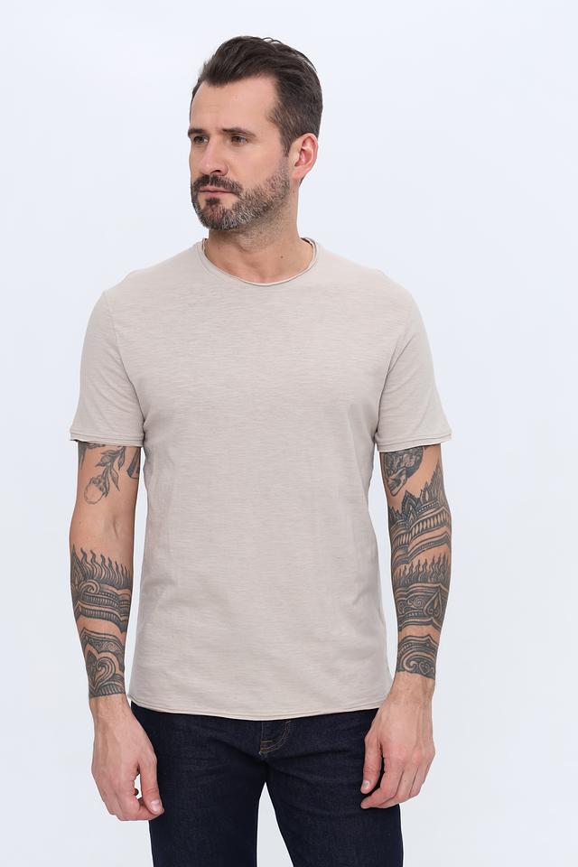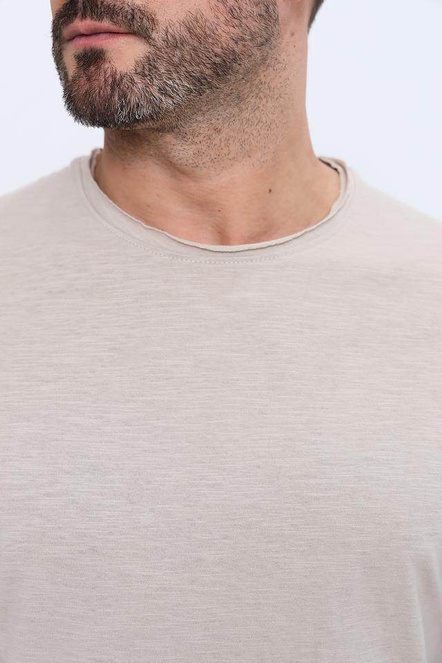 Модель имеет классический крой с круглым вырезом горловины и короткими рукавами. Особенностью данной модели является слегка необработанный край горловины, что придает ей более расслабленный и современный вид. Футболка идеально подходит для создания повседневных образов.