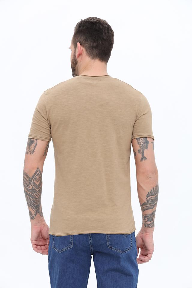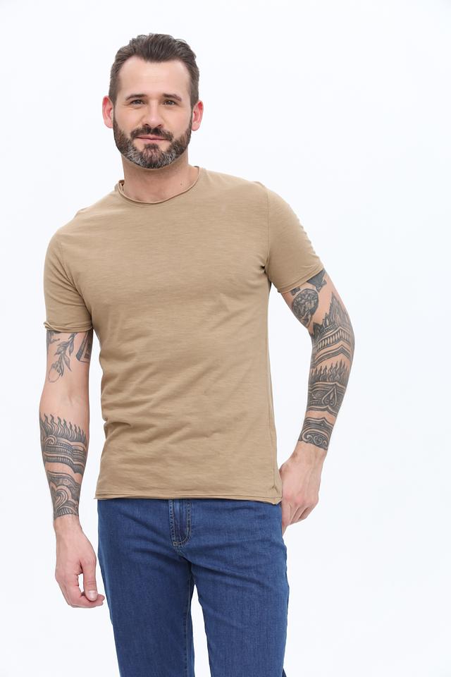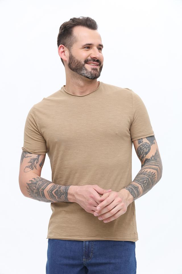 Данная модель имеет классический крой, прямой силуэт и круглый вырез горловины. Футболка выполнена в бежевом цвете, который легко сочетается с различными элементами гардероба. Отсутствие ярких принтов и декоративных элементов делает ее универсальной и подходящей для любого случая.
