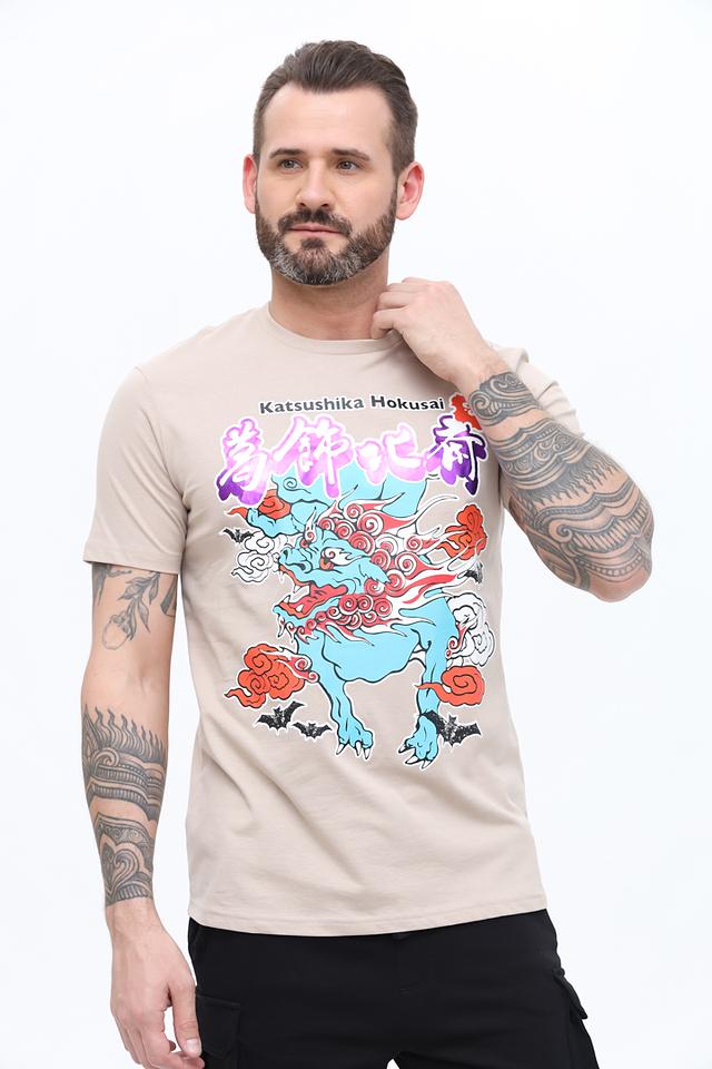 Основной цвет футболки – бежевый, который прекрасно сочетается с ярким и детализированным принтом в стиле работ японского художника Katsushika Hokusai. Принт изображает волну с драконом, выполненный в насыщенных синих, красных и белых тонах.