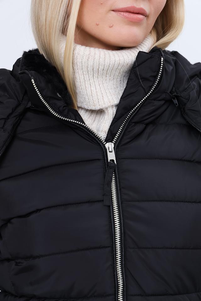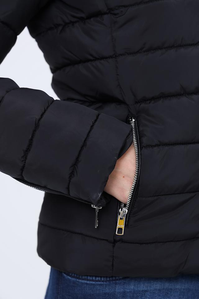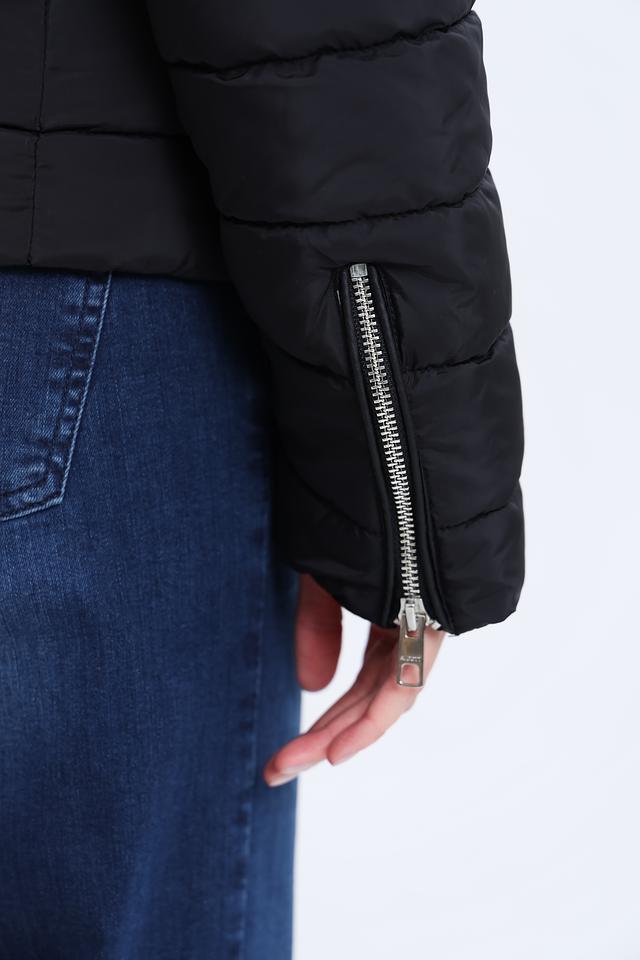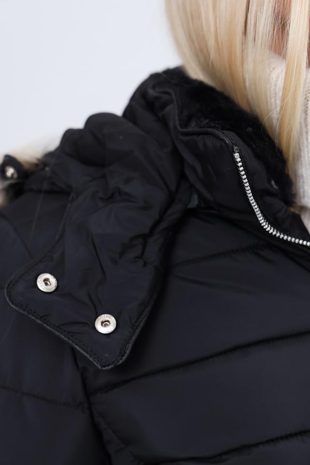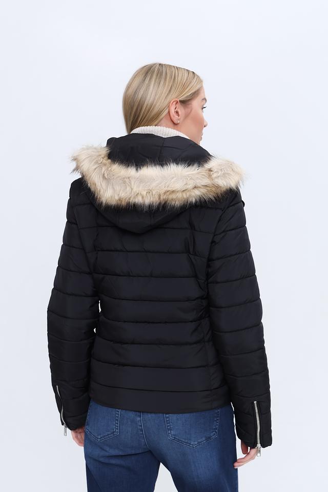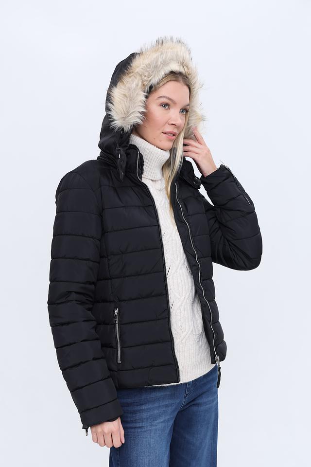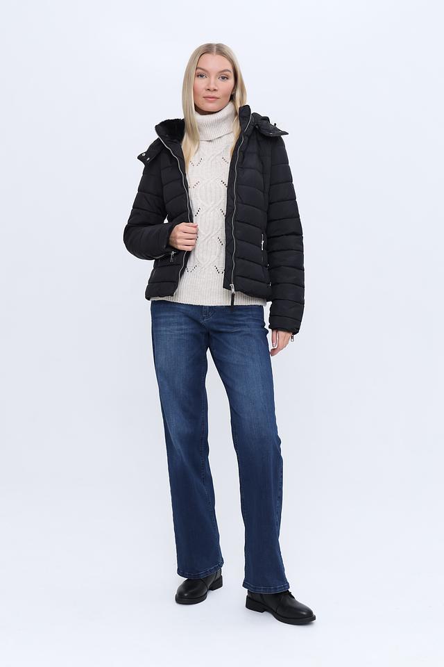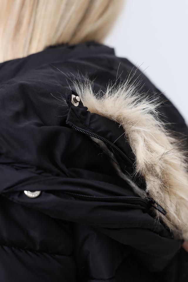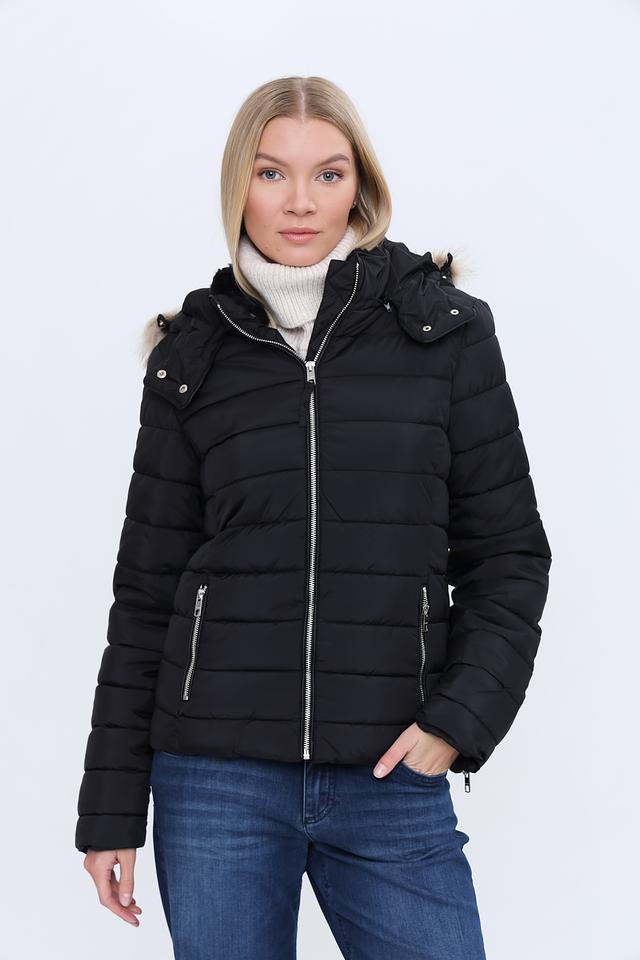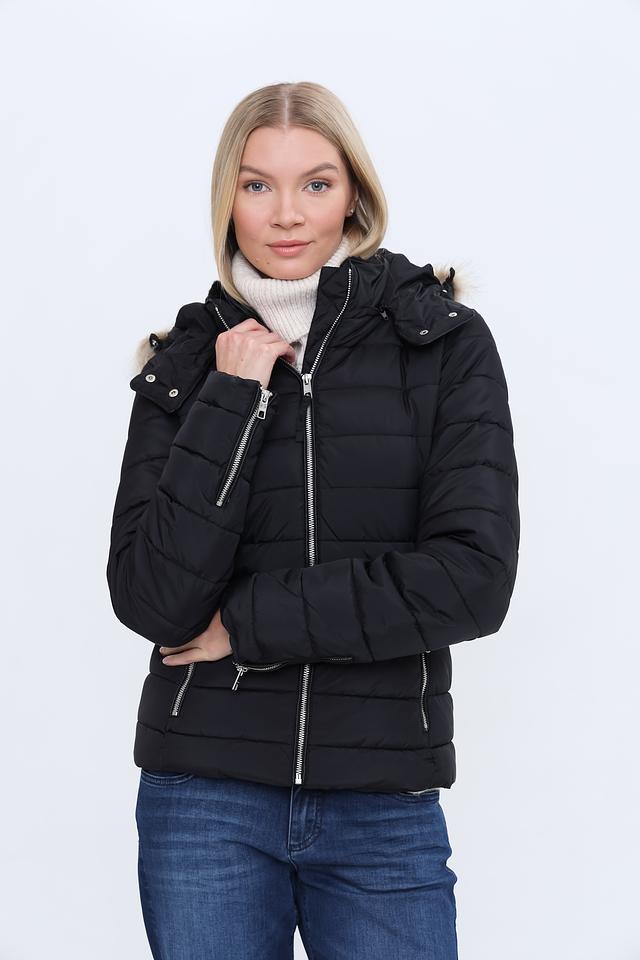Куртка имеет стеганую текстуру, которая придает ей современный вид. Капюшон украшен мягким искусственным мехом, который защитит от холода и ветра. Застежка – молния, дополненная ветрозащитной планкой.