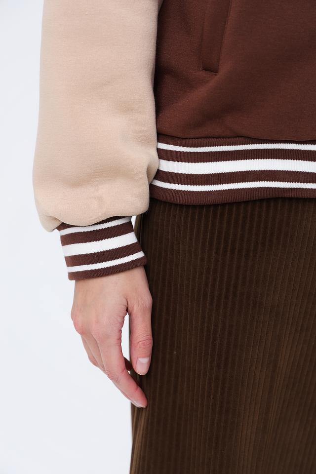 Эта женская толстовка от Alcott выполнена в стиле спортивного шика и станет отличным дополнением к вашему гардеробу. Основной цвет – насыщенный коричневый, который гармонично сочетается с бежевыми вставками на рукавах и воротнике.