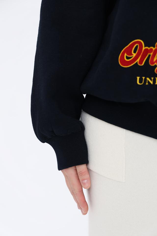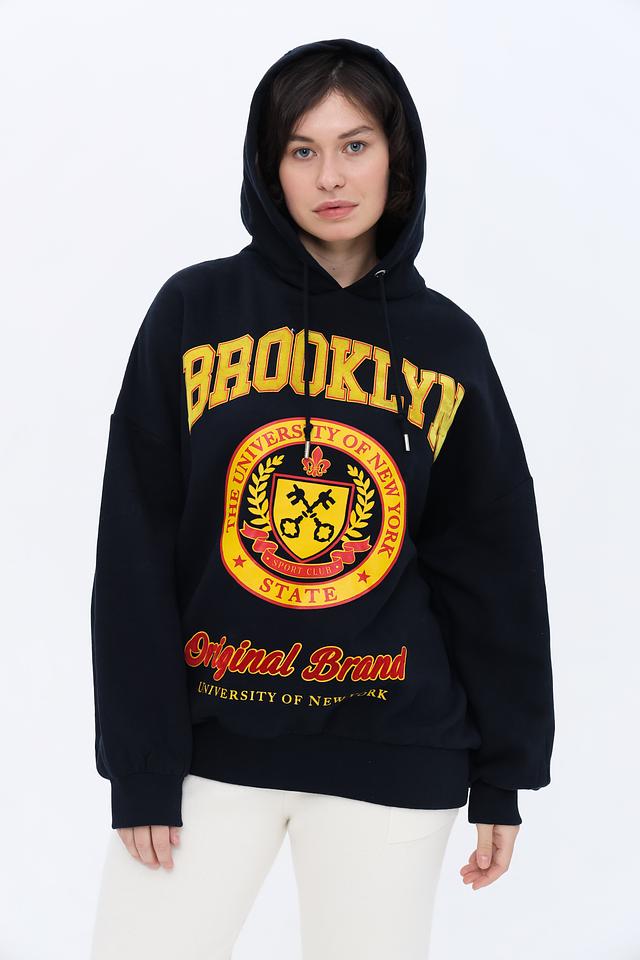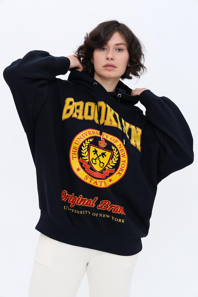 Основным акцентом является крупный принт "Brooklyn", выполненный в контрастных жёлтых и белых тонах. Также на толстовке присутствует изображение университетского герба и надпись "Original Brand".