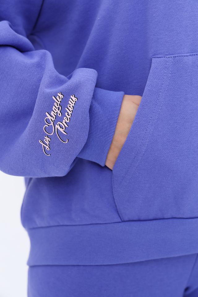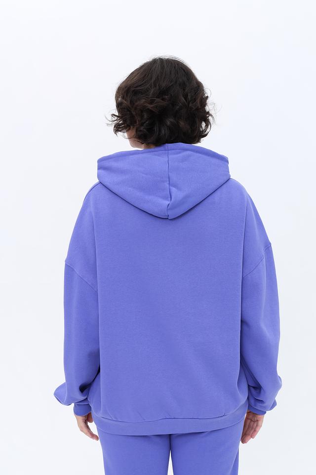 Толстовка имеет свободный крой, что обеспечивает комфорт и свободу движений. Капюшон добавляет функциональности и защищает от ветра. Манжеты и нижний край изделия выполнены из эластичной резинки, обеспечивающей плотное прилегание.