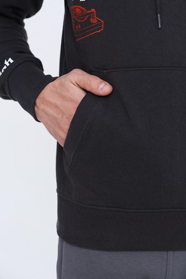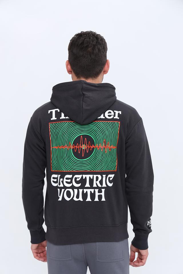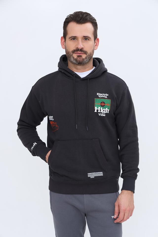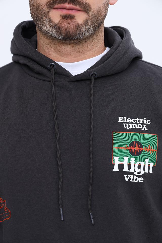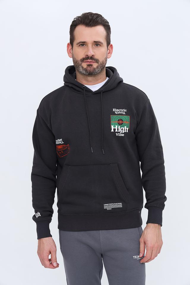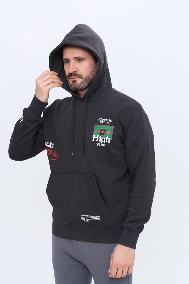 Толстовка украшена яркими графическими принтами на груди и спине, что придает ей индивидуальность и современный вид. Капюшон обеспечивает дополнительный комфорт и защиту от непогоды.