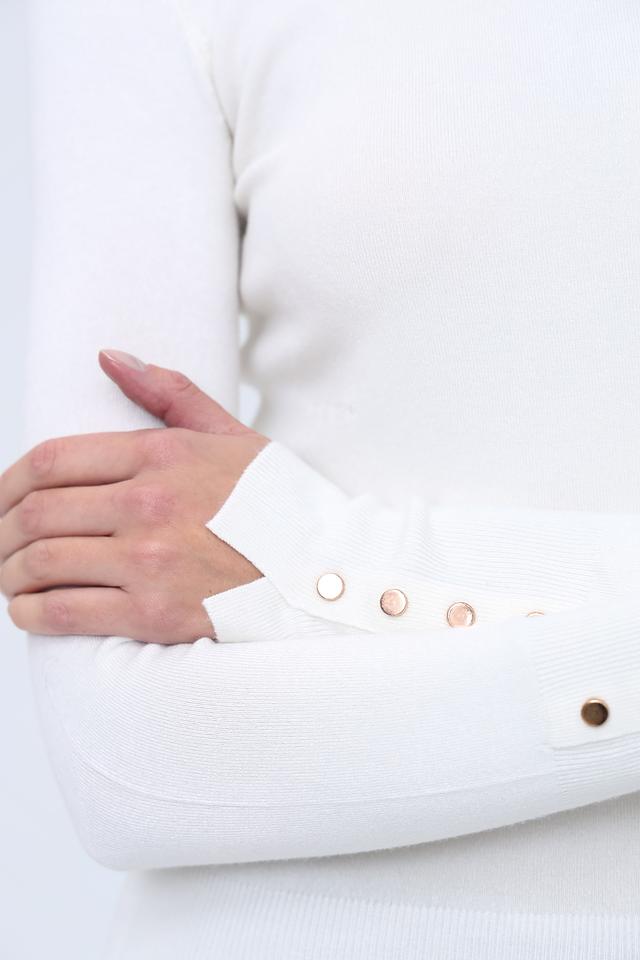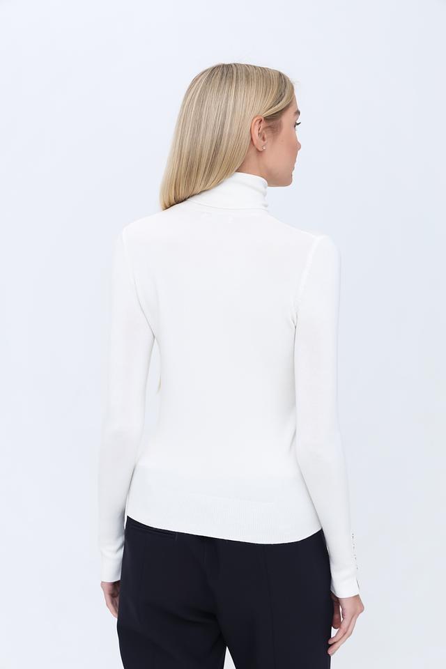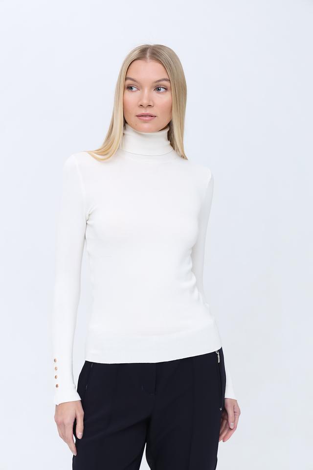 Модель имеет облегающий силуэт, подчеркивающий фигуру, и высокий воротник, который защищает от холода и придает образу изысканность. Рукава водолазки декорированы рядом аккуратных пуговиц, добавляющих ей оригинальности.
