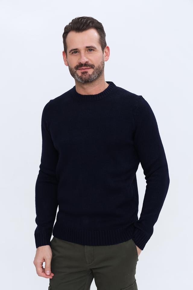 Джемпер имеет тёмно-синий цвет, который легко сочетается с различными элементами одежды. Изготовлен из 100% акрила, что обеспечивает мягкость, комфорт и простоту в уходе.