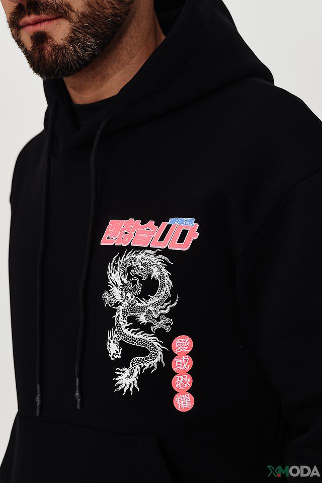 Толстовка Alcott – это стильный и удобный выбор для повседневной носки. Модель выполнена в классическом черном цвете и украшена эффектным принтом с изображением дракона на груди и спине.