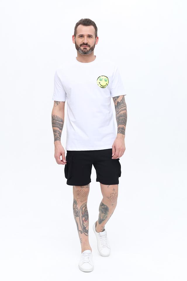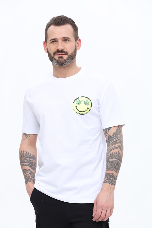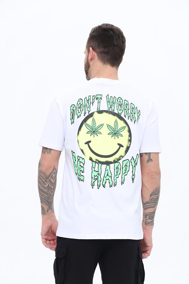 Особенностью данной модели является оригинальный принт на лицевой стороне — яркий смайлик с элементами растительного орнамента. На спине футболка также украшена крупным принтом с надписью "Don't Worry Be Happy" в сочетании с изображением смайлика.