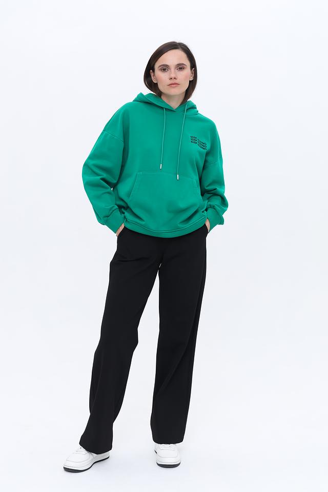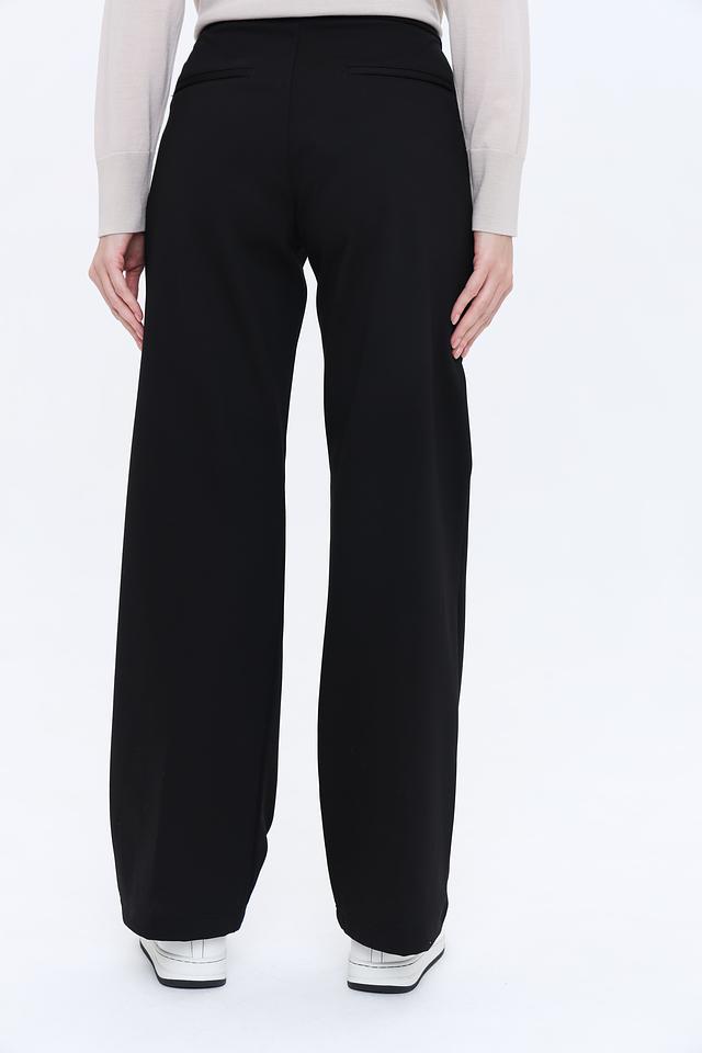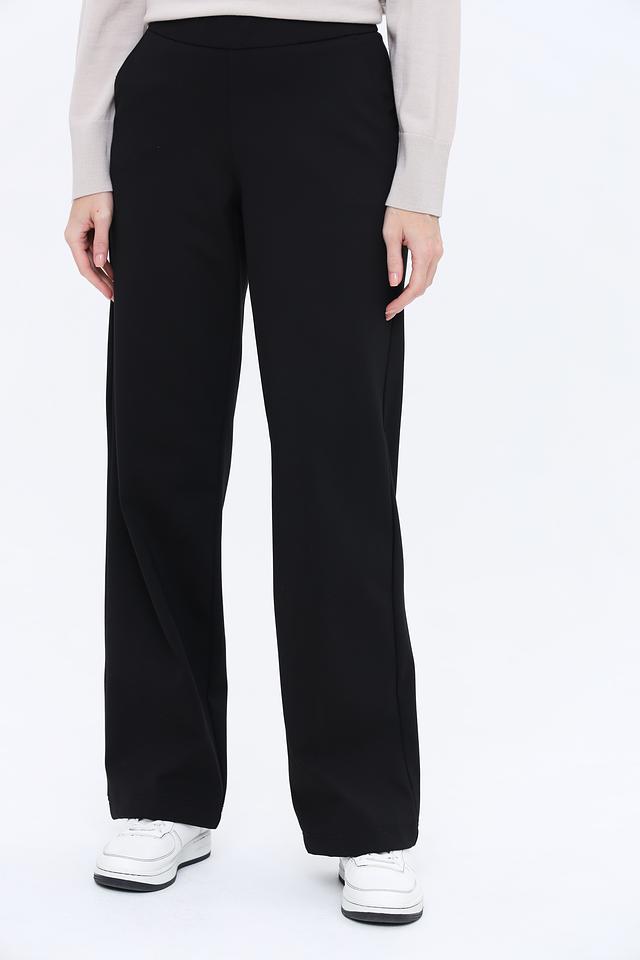 Брюки имеют широкий крой, который визуально удлиняет силуэт и создает эффект легкости. Высокая посадка подчеркивает талию и обеспечивает комфортную посадку. Ткань, состоящая из полиэстера, вискозы и эластана, приятна к телу и хорошо держит форму.