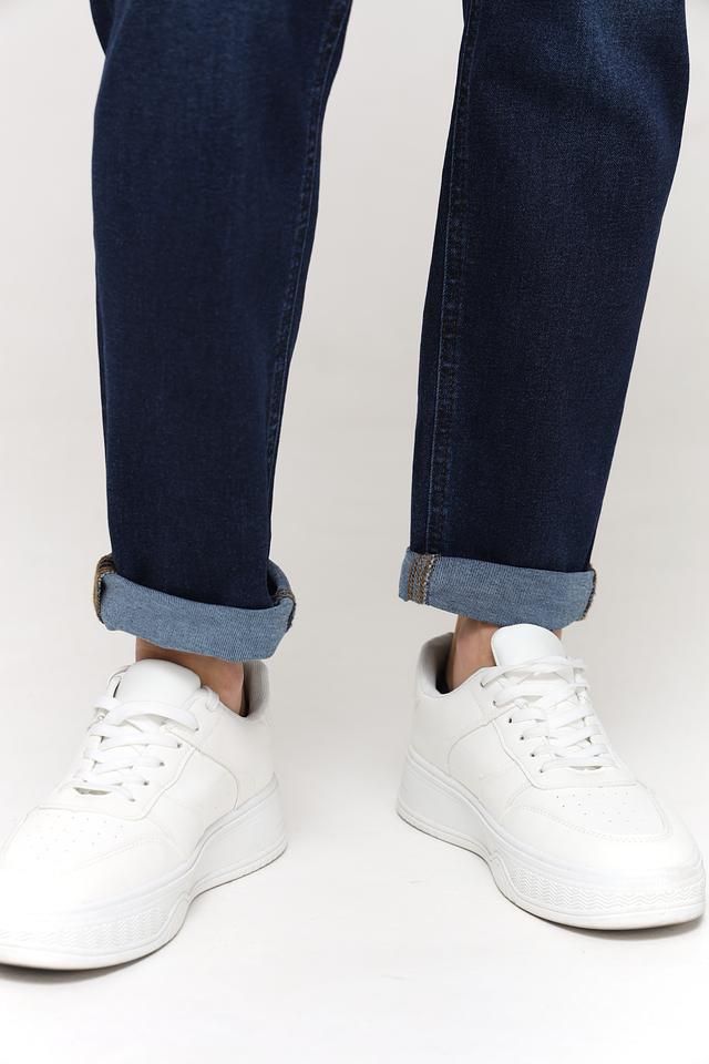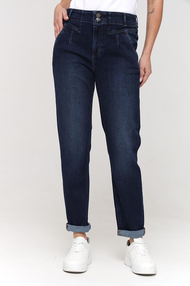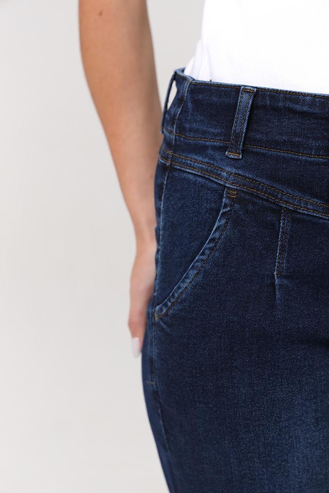 Джинсы имеют завышенную талию, которая визуально удлиняет ноги и подчеркивает фигуру. Декоративные складки на передней части брюк добавляют изысканности и оригинальности образу. Плотный деним обеспечивает комфорт и долговечность изделия.