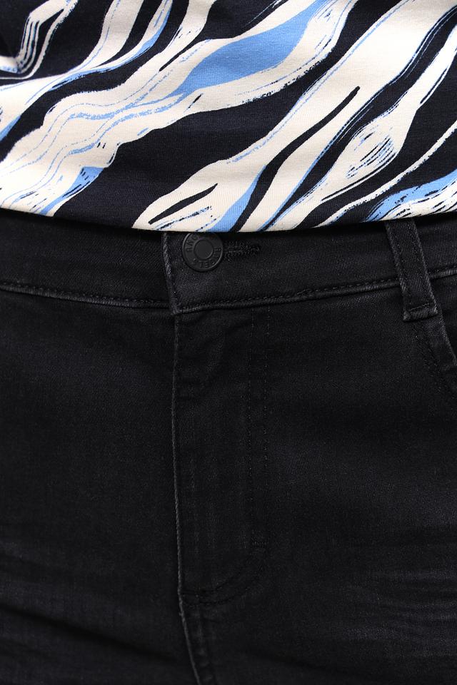 Джинсы имеют прямой крой в области бёдер и слегка расширяющиеся книзу штанины, что визуально удлиняет ноги и делает силуэт более пропорциональным. Высокая посадка обеспечивает комфортную посадку по талии и подчеркивает достоинства фигуры.