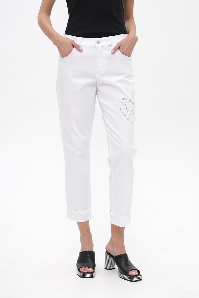 Белые укороченные джинсы Angels из хлопка с полиэстером и эластаном. Модель украшена вышивкой в виде лица. Удобный крой и стильный дизайн. Состав: хлопок 77%, полиэстер 20%, эластан 3%
