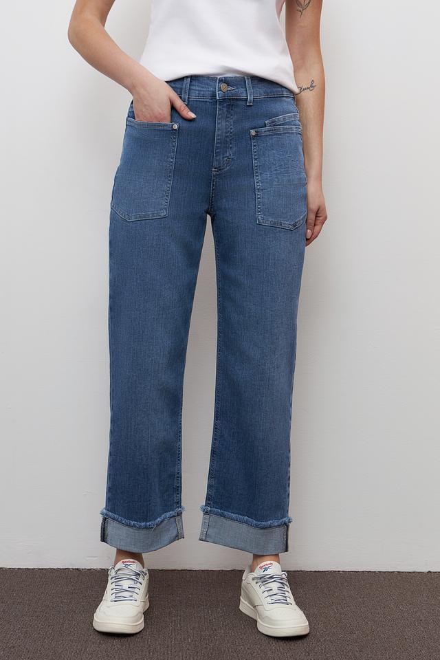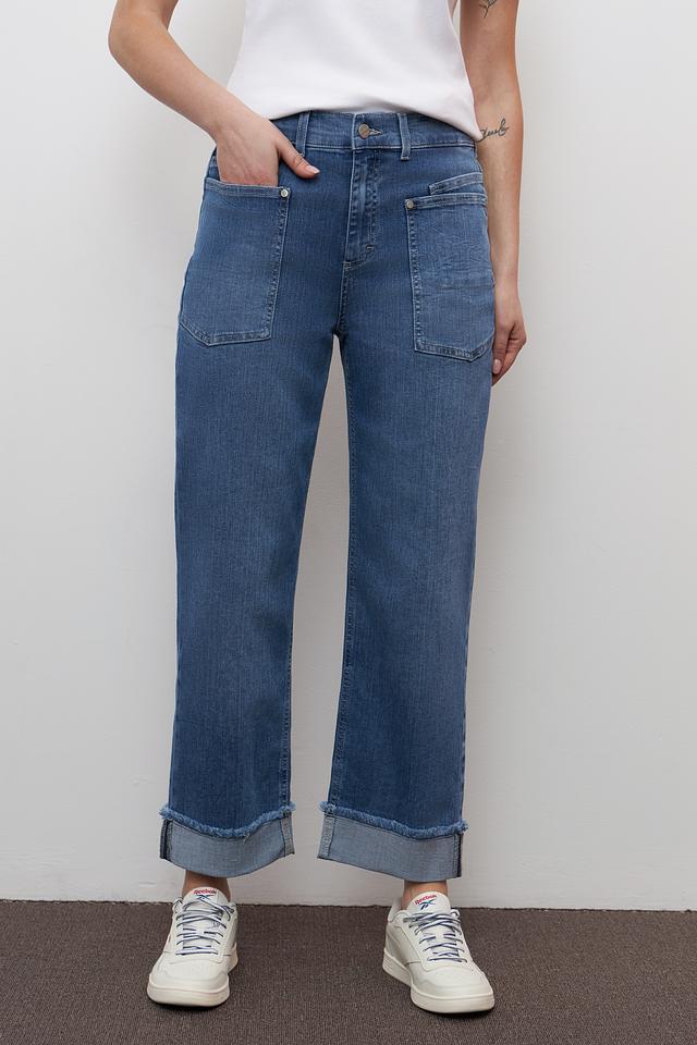 Джинсы имеют прямую посадку и широкие штанины, что делает их актуальным выбором для создания модных образов. Наличие накладных карманов добавляет функциональности и оригинальности дизайну. Застежка на молнию и пуговицу обеспечивает надежную фиксацию.