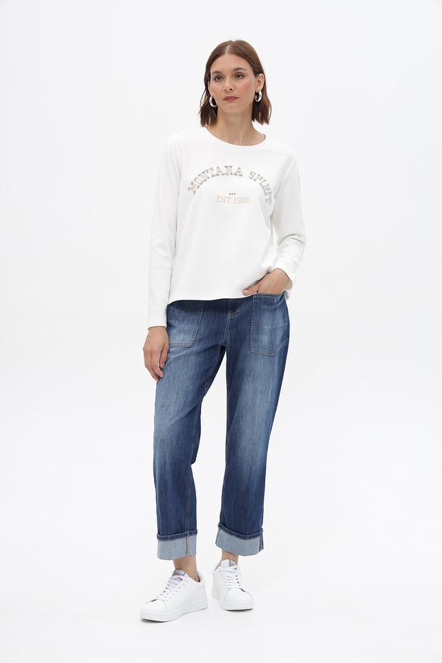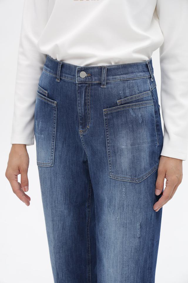 Джинсы имеют прямой крой и высокую посадку, подчеркивающую талию. Отличительной особенностью модели являются два больших накладных кармана на передней части брюк, добавляющие образу функциональности и оригинальности.