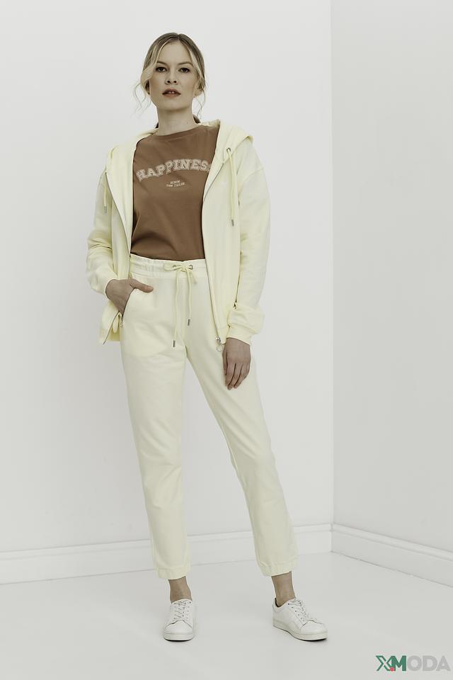 Брюки изготовлены из высококачественного хлопка (95%) с добавлением эластана (5%), что обеспечивает мягкость, комфорт и хорошую посадку по фигуре. Эластичный пояс дополнен функциональным шнурком для регулировки и боковыми молниями, добавляющими модели современный вид.