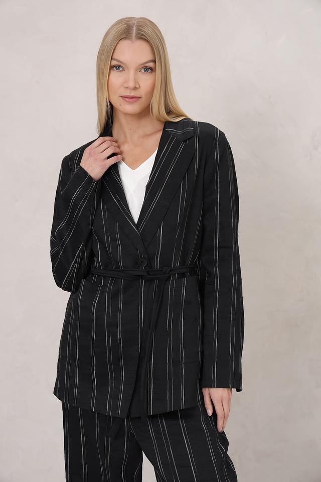 В комплекте с жакетом идет пояс, который можно использовать для акцентирования талии и создания более женственного силуэта. Жакет выполнен из качественного материала, в составе которого преобладает лен (89%) и полиэстер (11%), что обеспечивает комфорт и долговечность изделия.